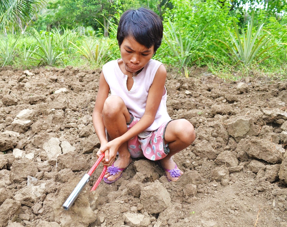 土がとてもかたく、木の棒でたたく、石でつぶす、土を投げるなど