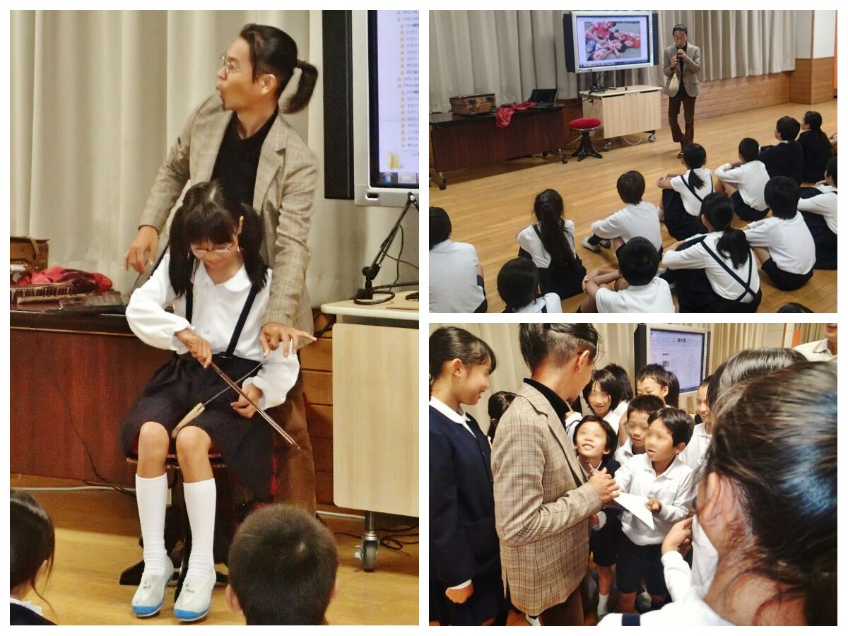 音楽の授業では竹音楽隊の活動を紹介し、こどもたちのDVDの演奏に合わせて