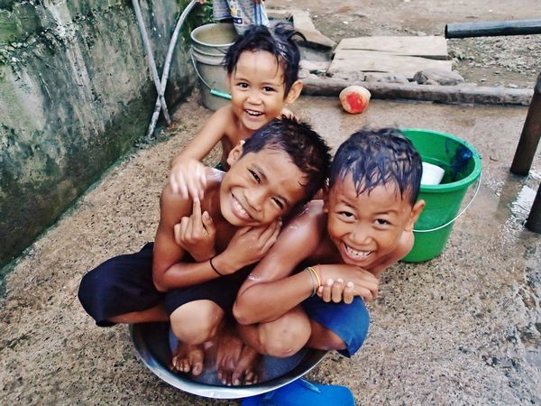 こんなふうに小さな洗面器にギュウギュウに入って青空の下で水浴びするのもいいものですよ。