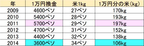 そして、そのお金で米が何キロ買えるのかを表にしてみました。
