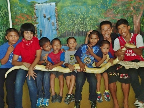 「触れ合える」のがこの動物園のいいところです。巨大な白ニシキヘビと一緒に記念撮影!