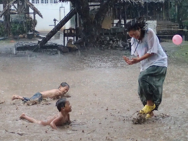 午後からは急に土砂降りになりました。さっそくこどもたちが泥んこ遊びです!