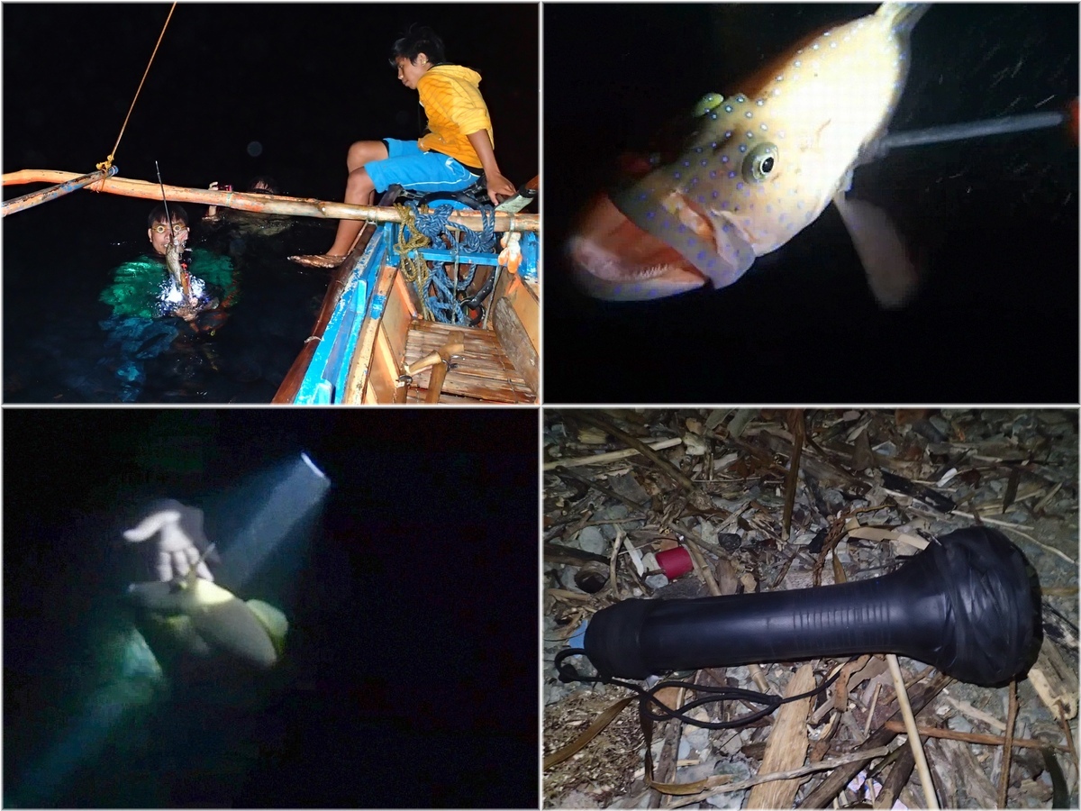 真っ暗な海でどうやって魚を探すのかと思ったら、なんと懐中電灯片手に潜るんです。