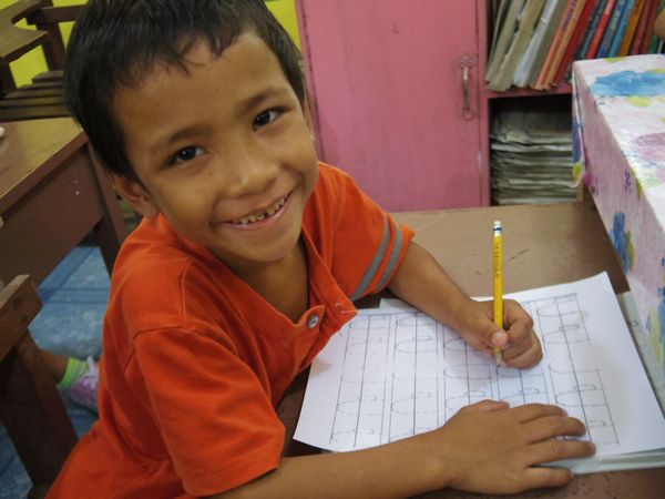 子どもに丁寧に勉強を教えていました。学校に通ってまだ3週間のバドンですが、ちゃんと勉強