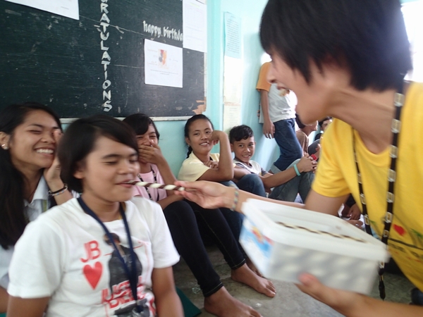 それから、用意したお菓子を、こどもたち1人1人に「あ~ん」してあげる、という方法で配りました。