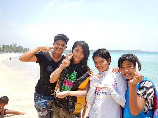 こどもたちは真っ白な砂浜と真っ青な空、ウラワとは違う大きな波に大喜び!