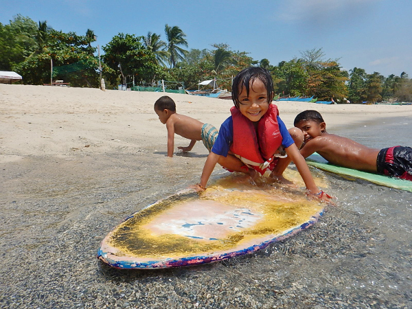 初めてここに来たエミリーも大喜び!地元の子にボディーボードの遊び方を教わって、