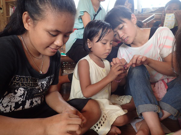 トモコさんに教わって、女の子たちが輪ゴムのアクセサリーを作っています。