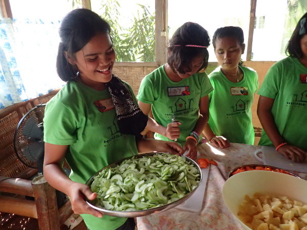 ニンニクをみじん切りにする方法や、キュウリを素早く薄くスライスする技を教わって女の子たちは大喜び!