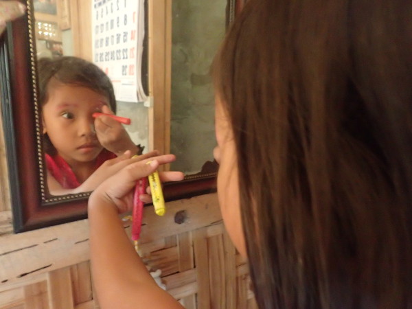 朝からエミリーが、鏡に向かって一生懸命何かしています。手に持っているのは…クレヨン?