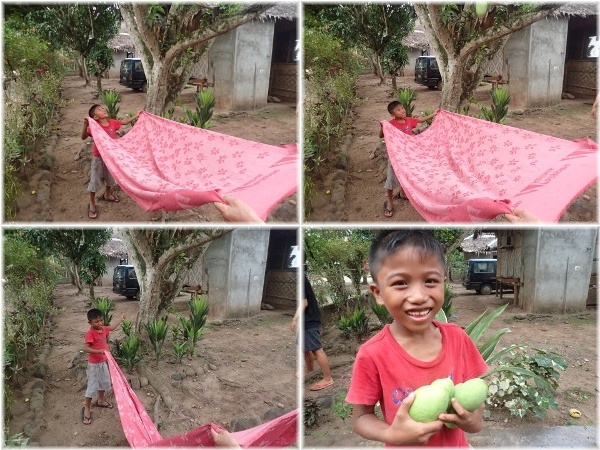 スタッフたちが下でブランケットを持って待ち構えて、リッキーが投げたマンゴーをキャッチします。
