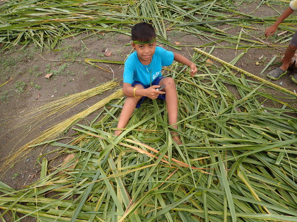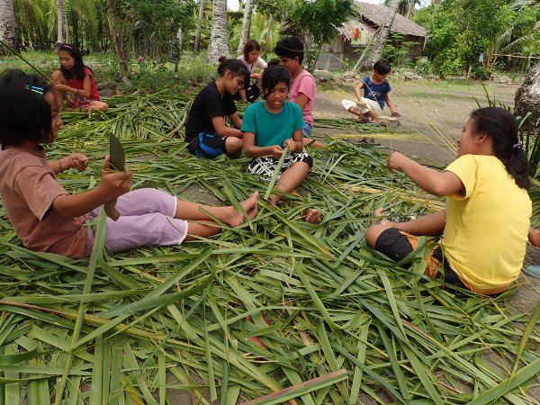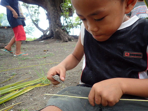 今日は朝からみんなでウラワビーチに行って、ヤシの葉で「ホウキ作り」をしました。