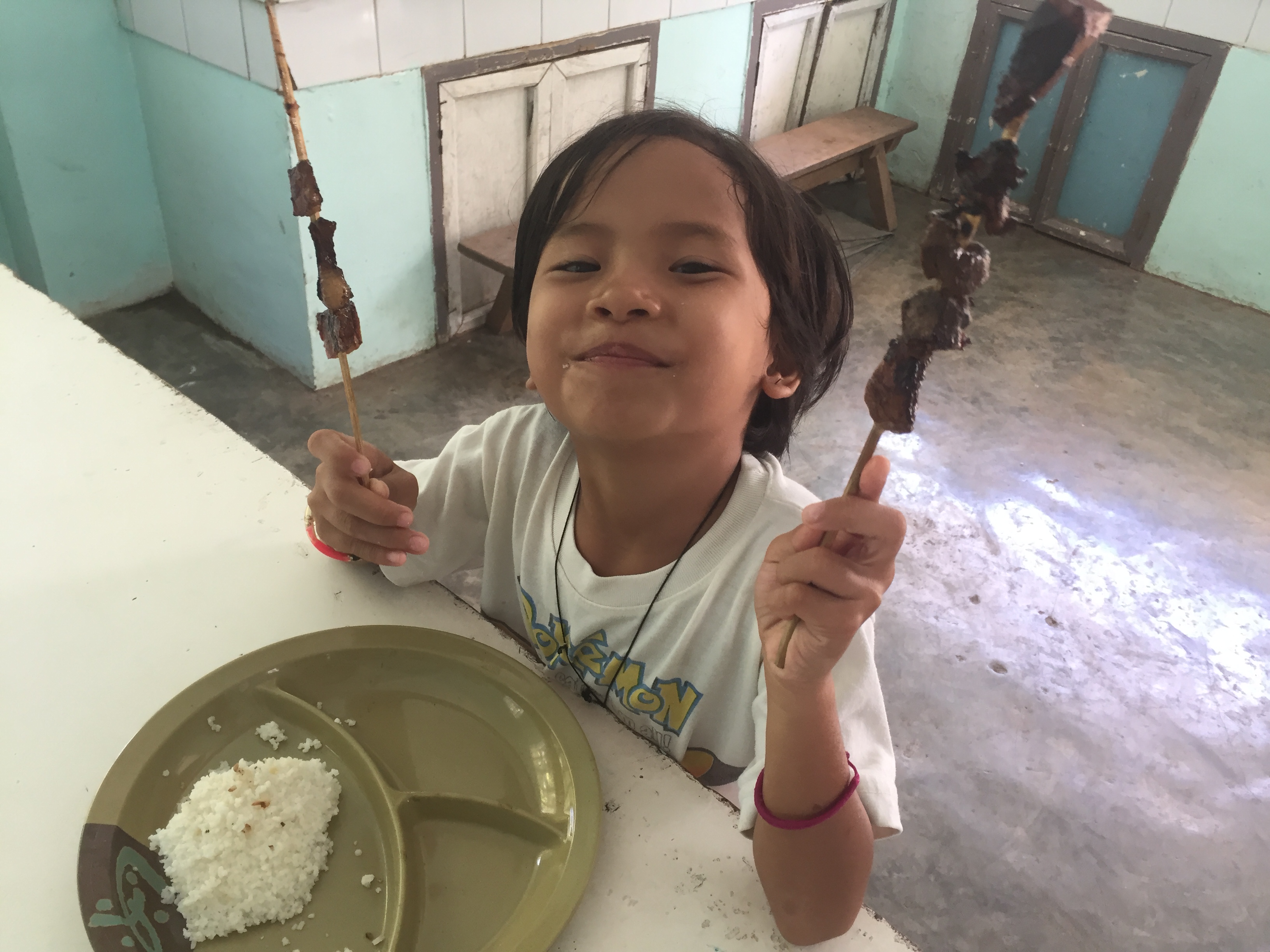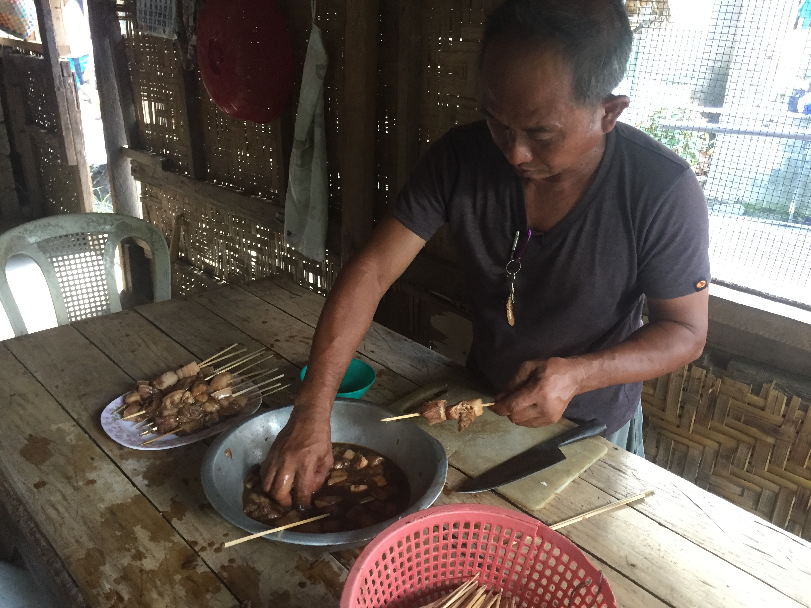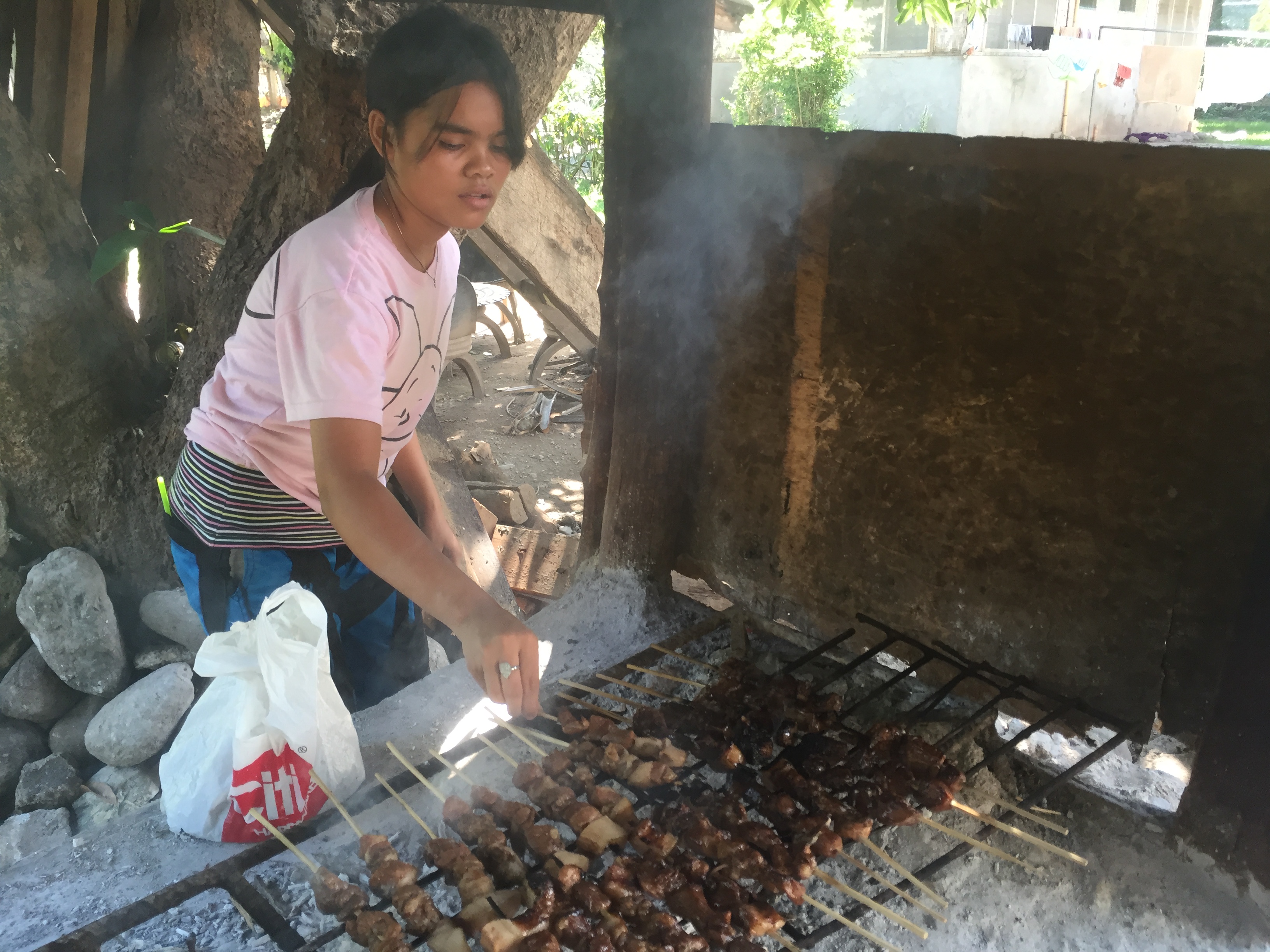 子ども達の大好きなバーベキューです!キッチンで、スタッフのフィデルさんが一本一本串に豚肉を刺していました。