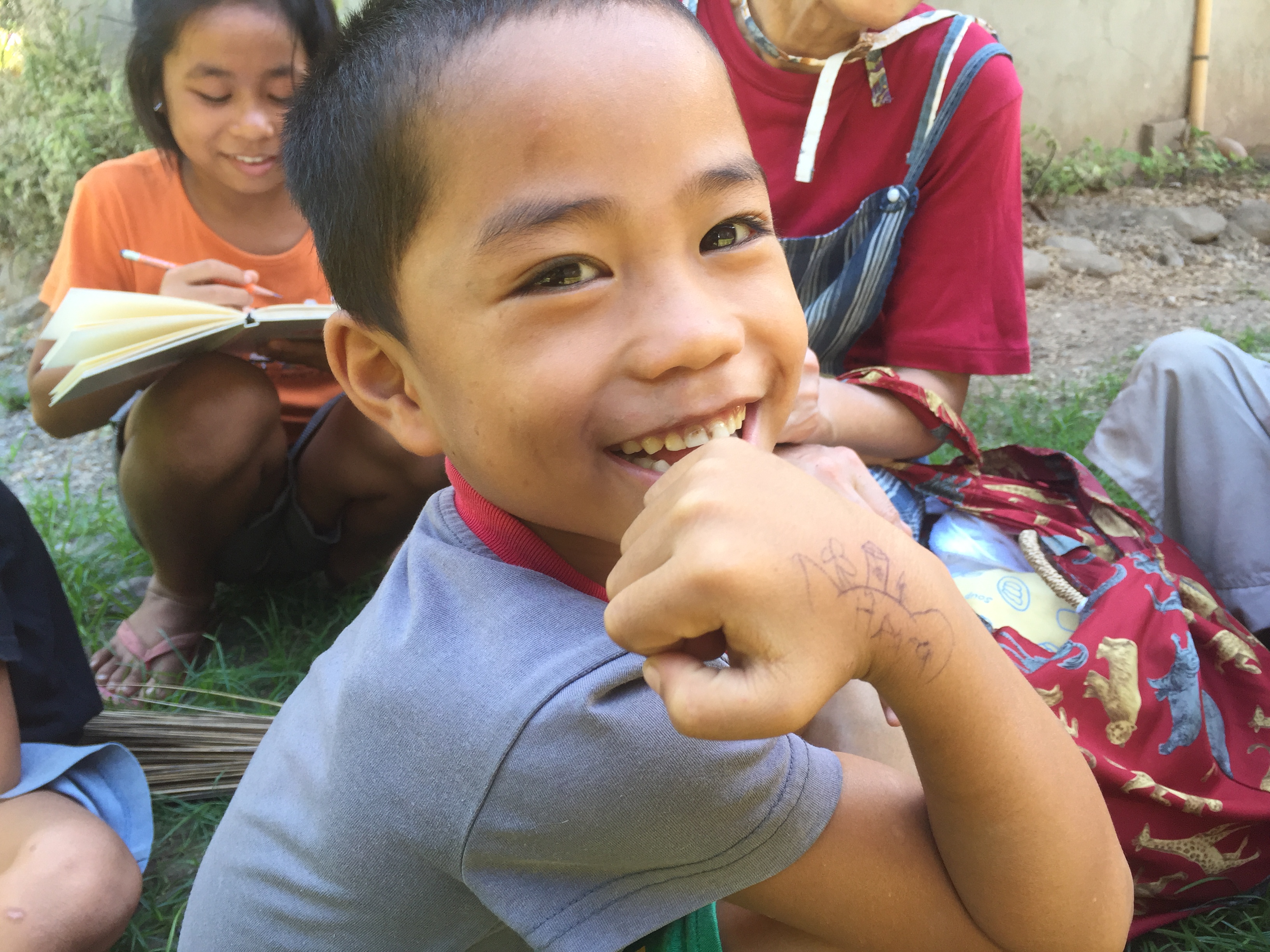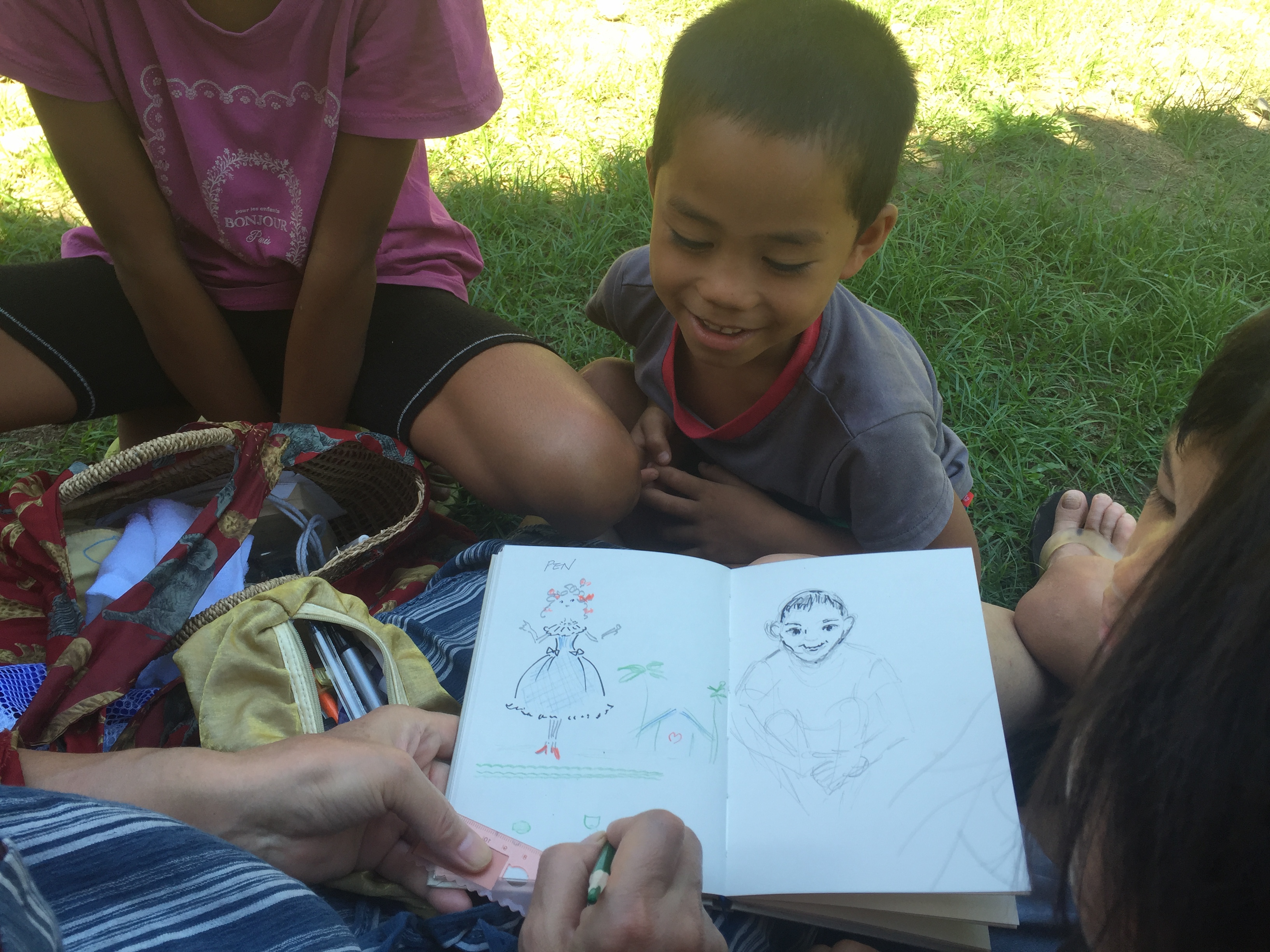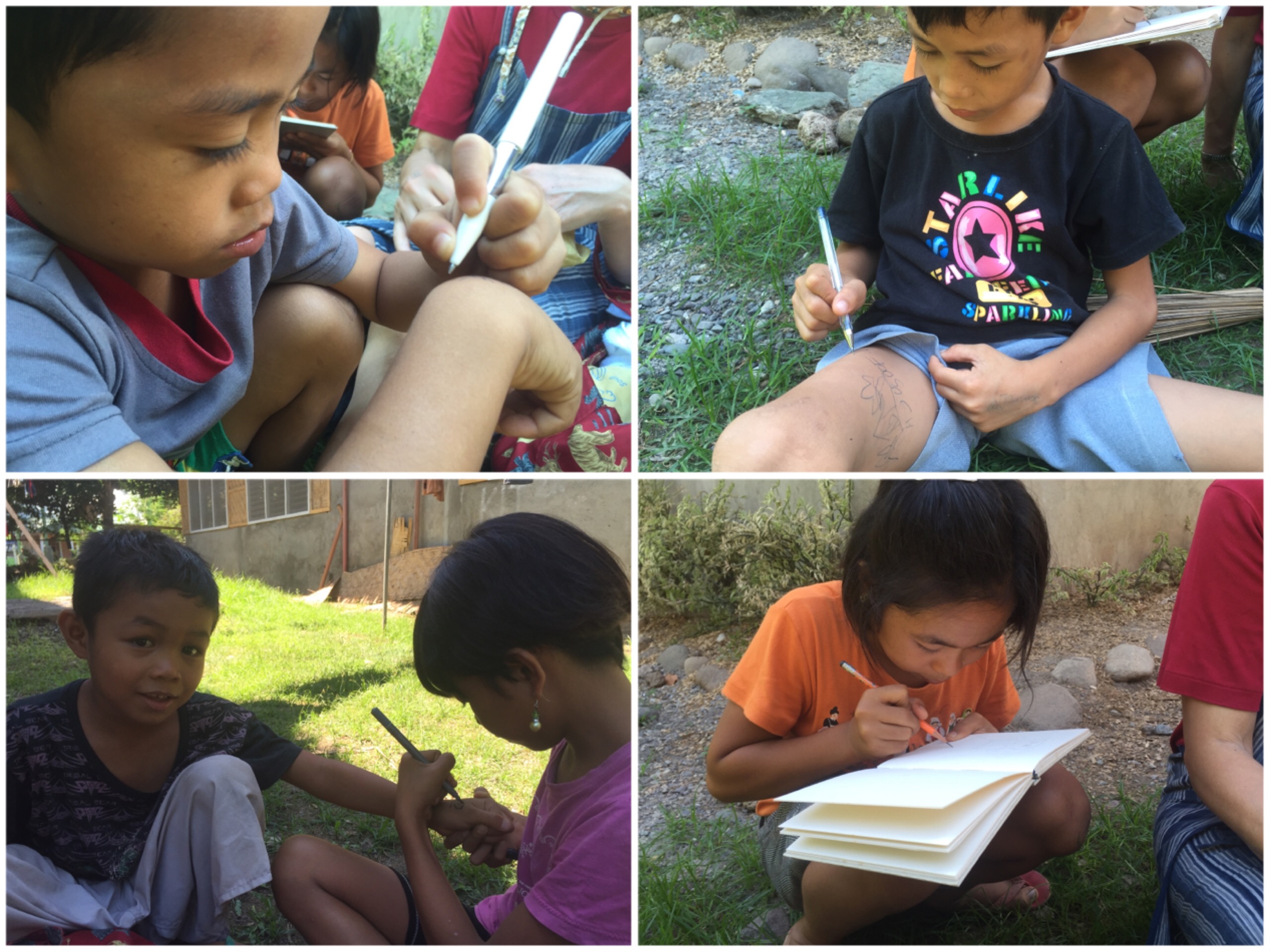 スケッチを見ていたら、なんだかみんなも描きたくなりました。それぞれ、ノートや手や足などに描き始めました。絵を描いている子ども達の表情は、真剣そのもの。手に絵を描いてもらっているリッキーガマイだけがソワソワしていました(笑)