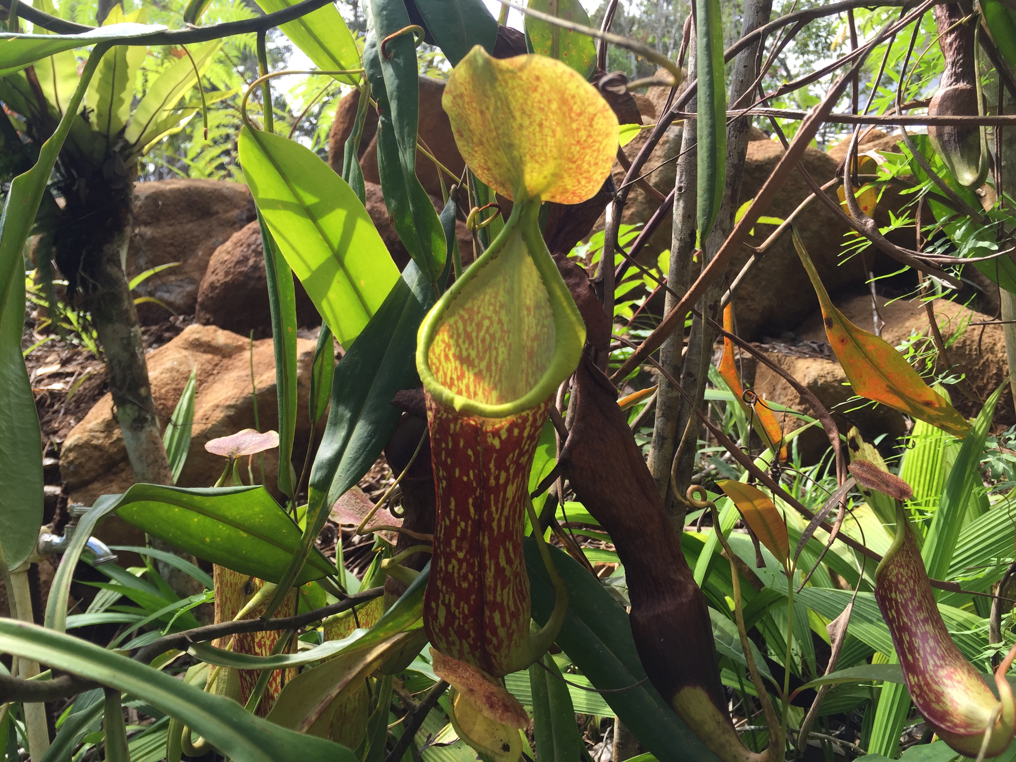 上の写真はピッチャープラントという食虫植物で、中に虫が入ると上のフタがパカッ!っと閉まるそうなんです!