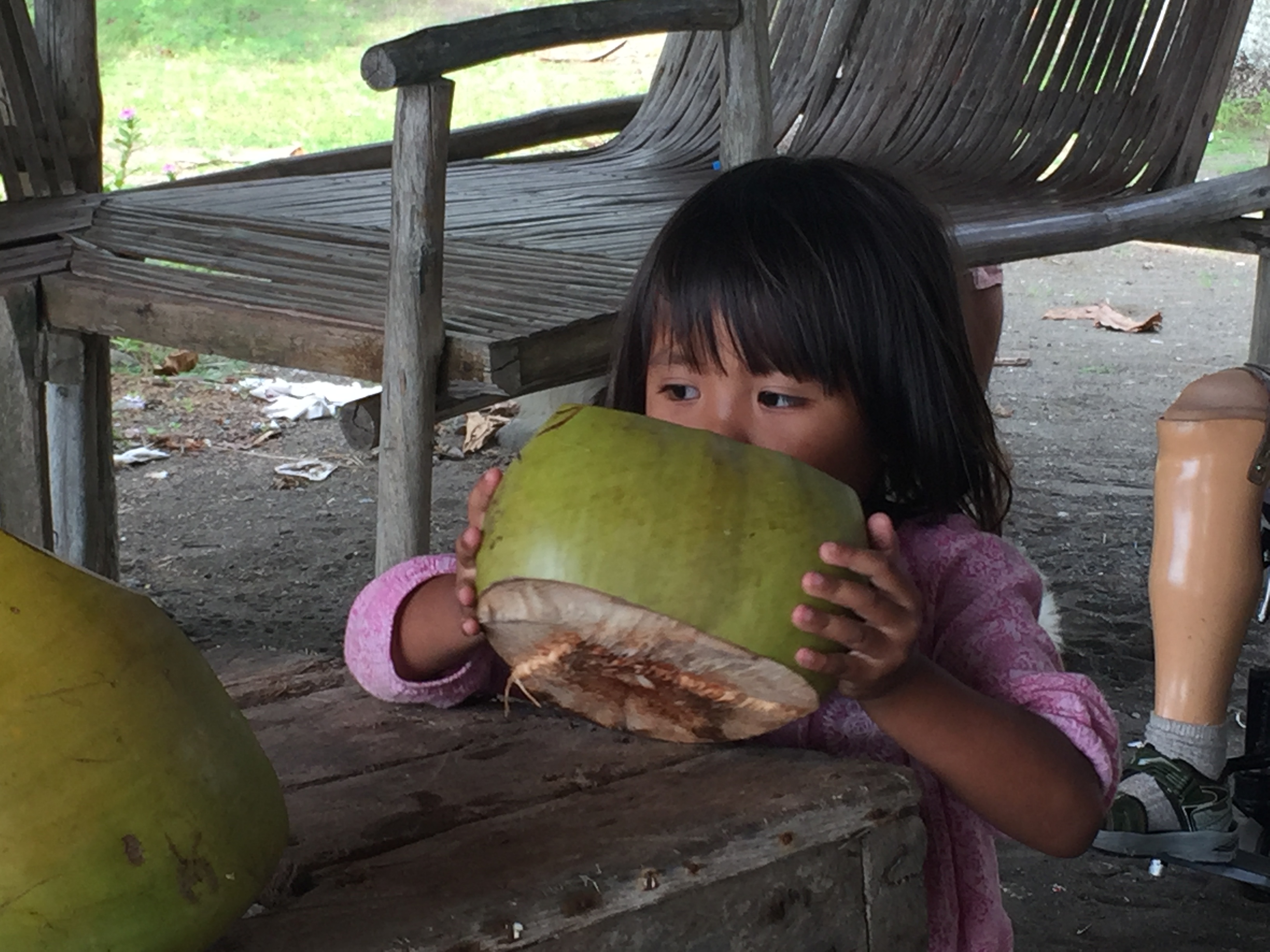着くと、ウラワビーチに住んでいるハウスオブジョイの卒業生マリアフェの娘のカカイが、顔より大きなヤシの実のジュースを飲んでいました!私たちもわけてもらって、ココナッツジュースを飲みたかったというビジターのみなさんの夢が叶いました。