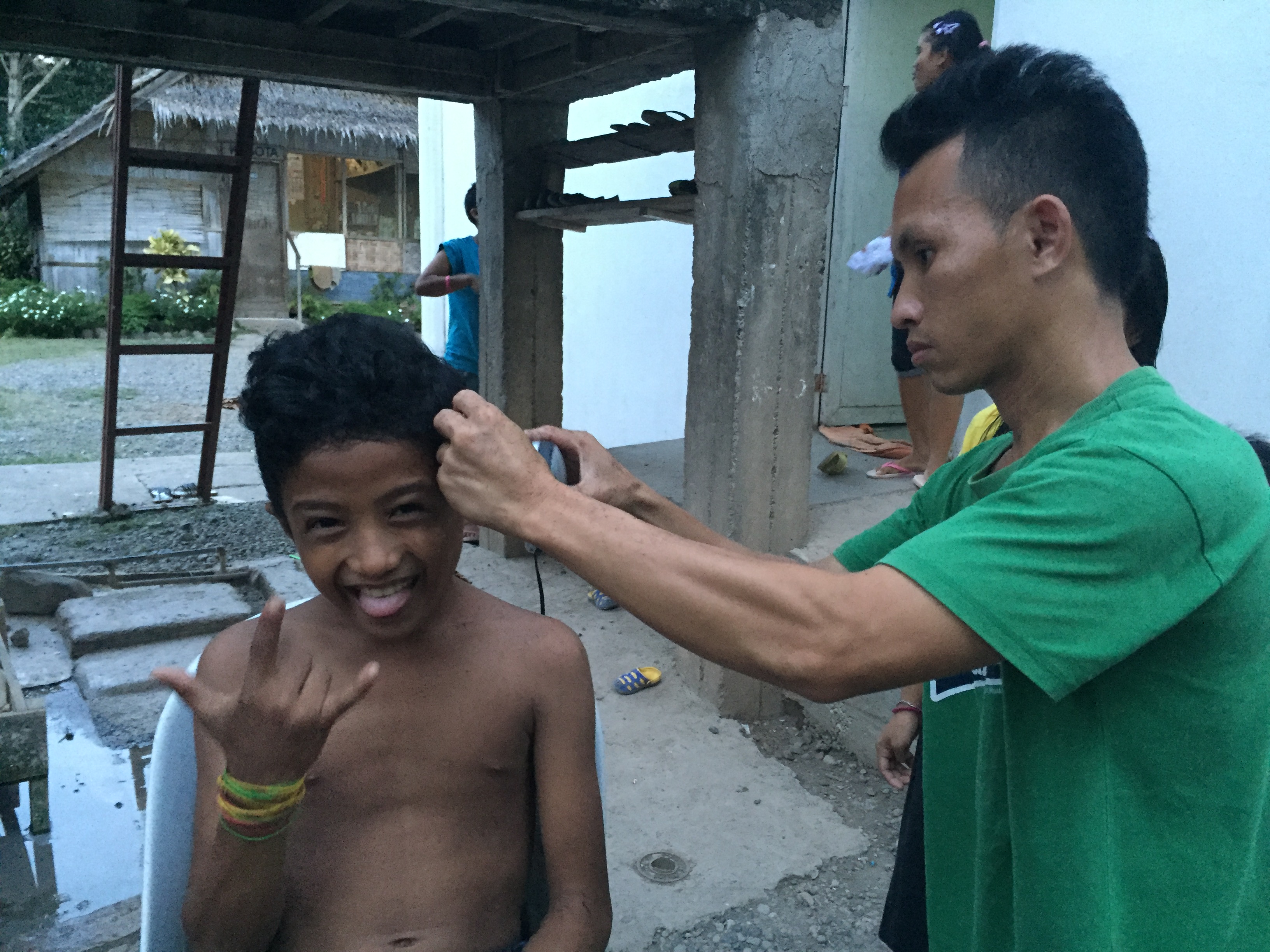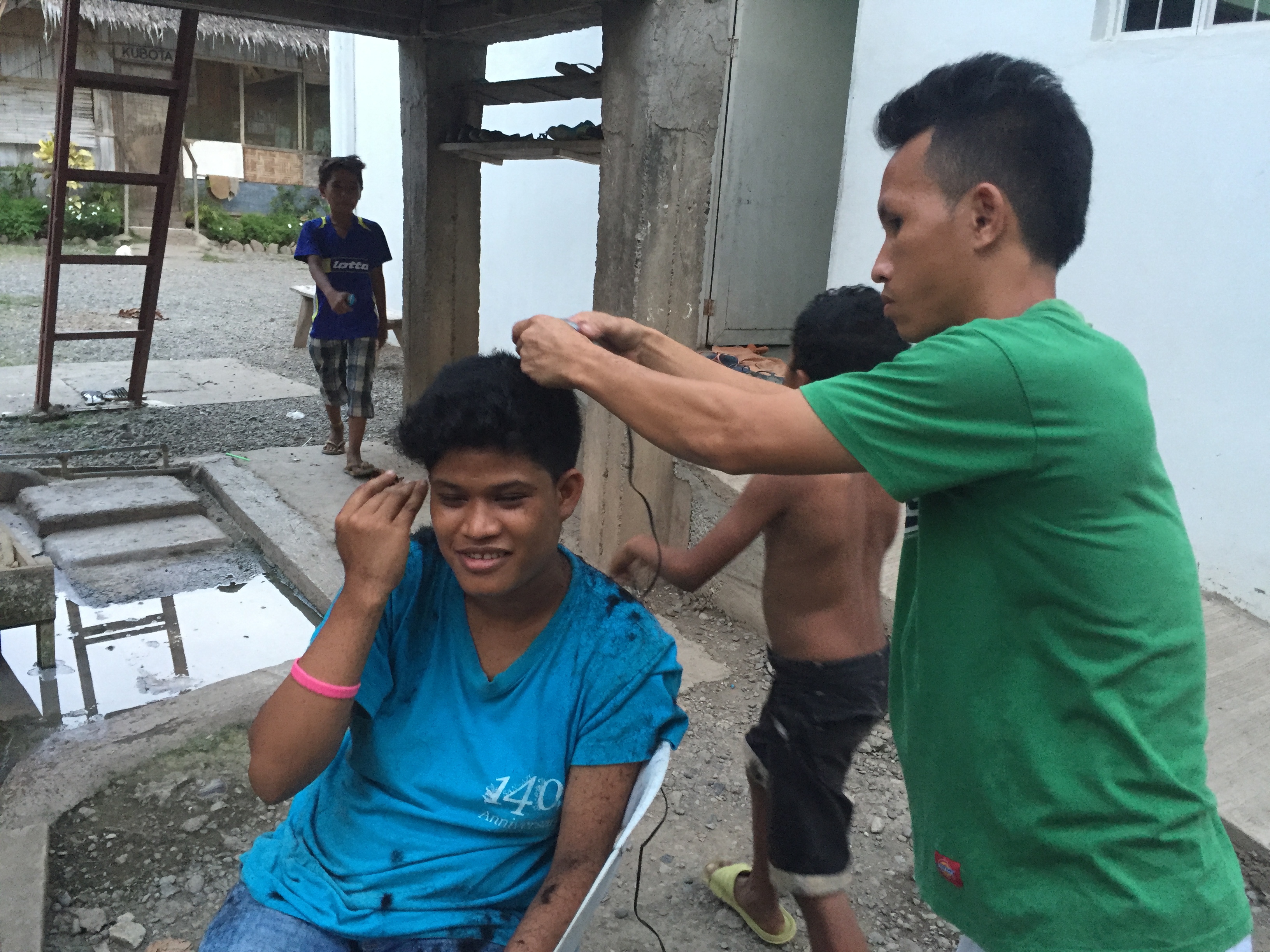 今は、キッチンの前で卒業生でお手伝いのアルチーが、ロサとJMの髪をカットしています。髪を切れる人がいると、床屋さんに行かなくてもいいので嬉しいですね!