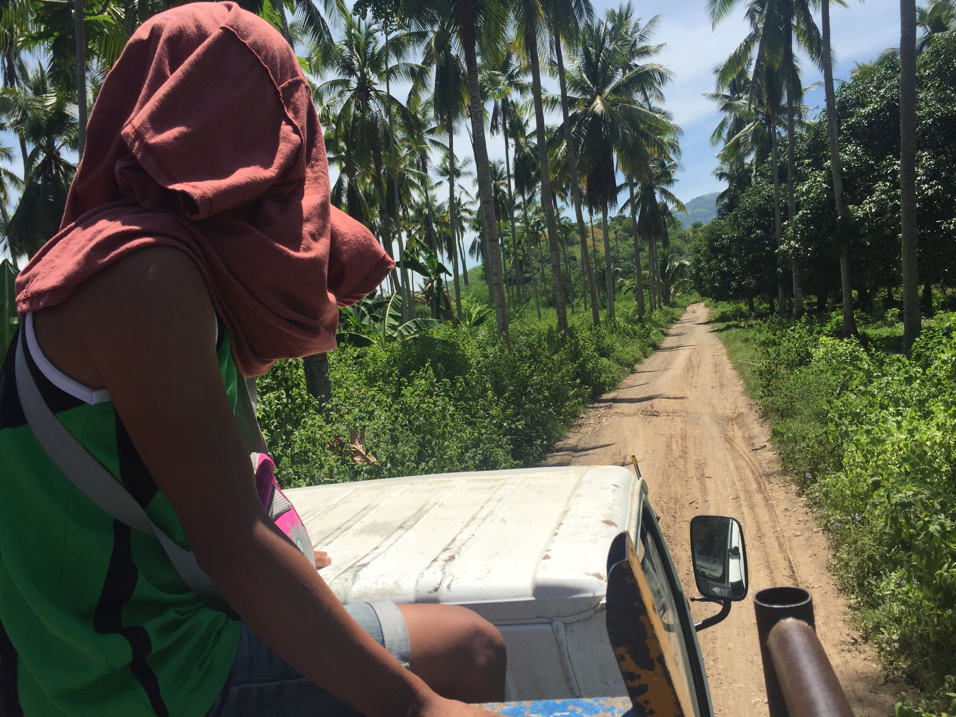 大きいトラックの荷台に乗って、海岸へ向かいます。みんなテンションが上がりました!