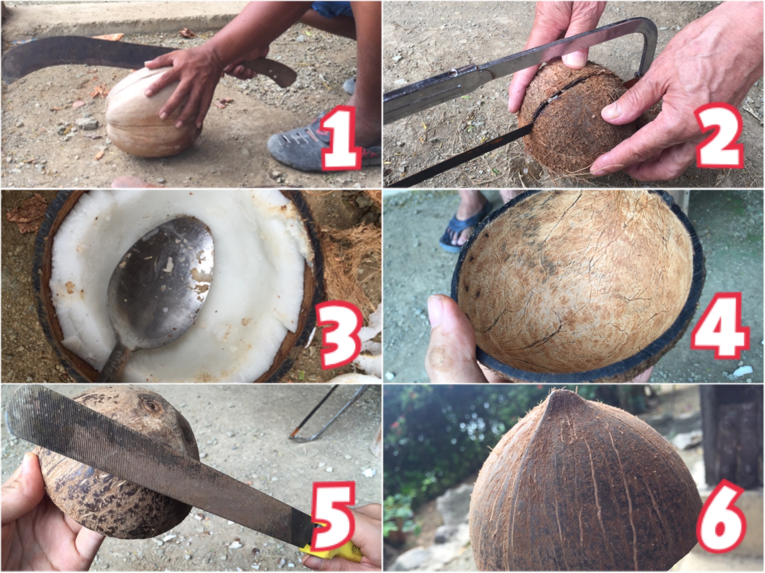 ①落ちて乾燥したヤシの実をとってきて、外側の皮をむきます。