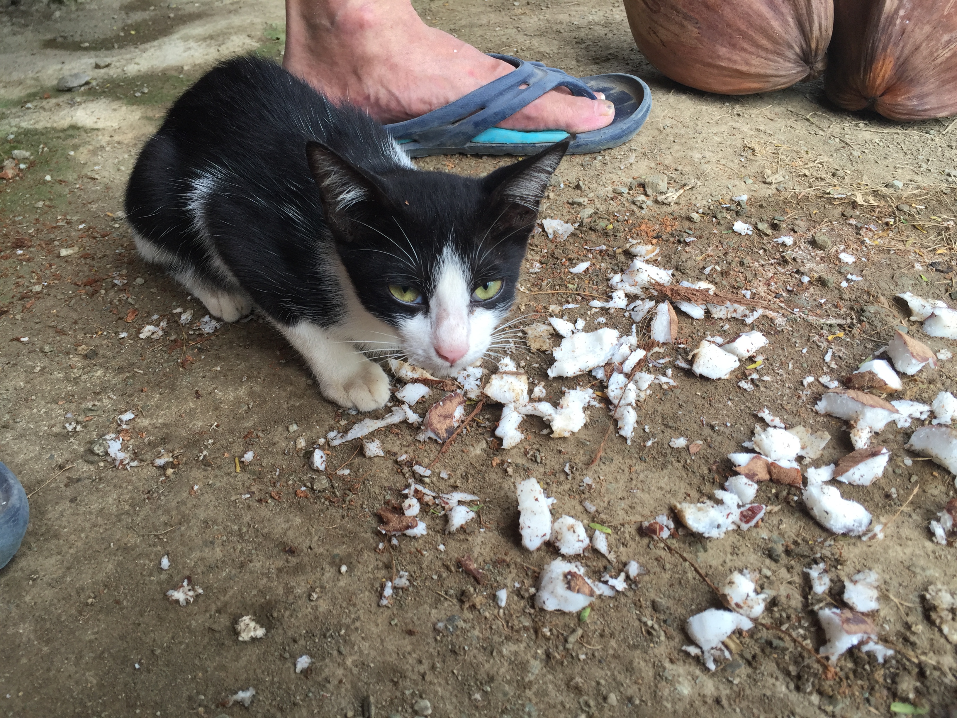 白いヤシの実は食べることができます!猫も、もちろん人間も!ジュースもおいしいですよ。ヤシの葉はホウキに、ヤシのお酒も木からとれます。むいた皮は、料理をする時の火の薪になります。ヤシの木、すごい!