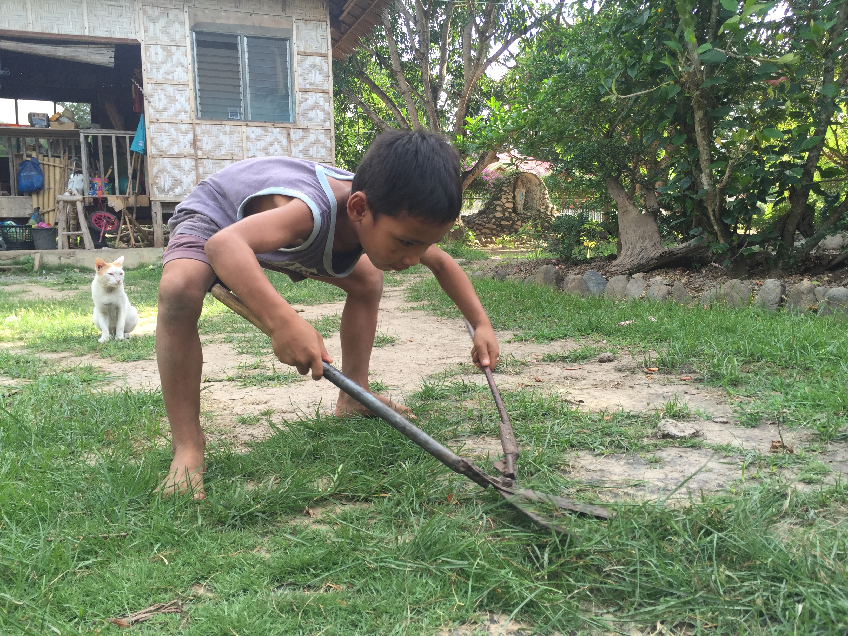 いつもはボールで遊んだり、犬を追回したりしていますが、今日は朝から草刈りのお手伝い!足を踏ん張って、真剣です。