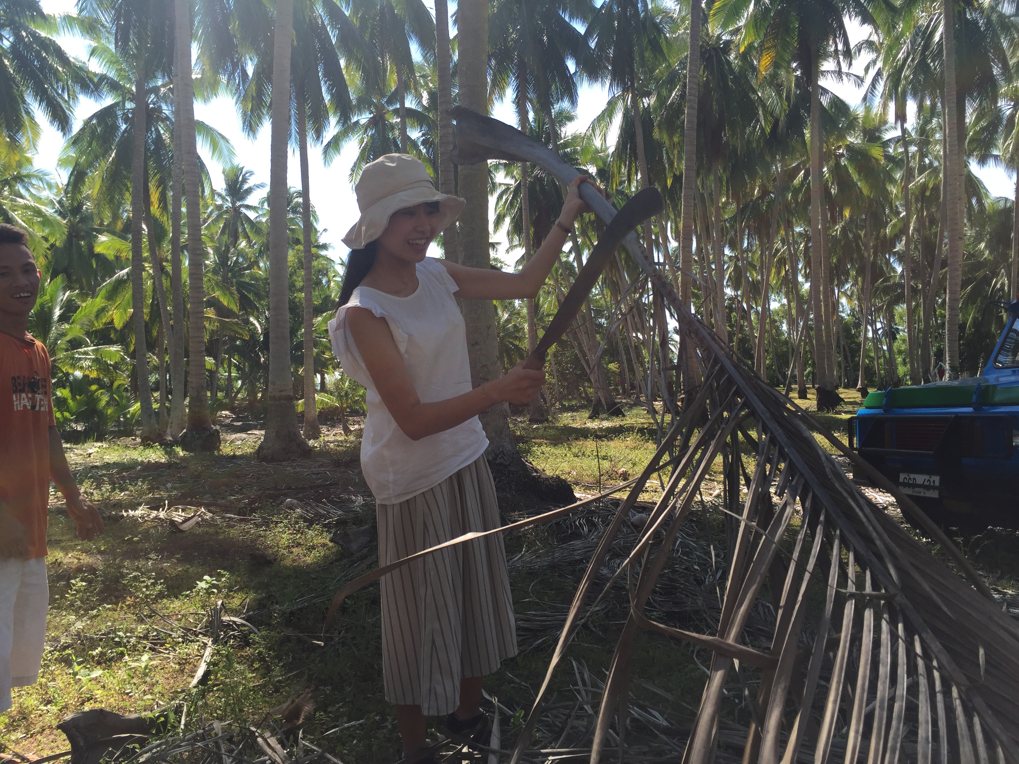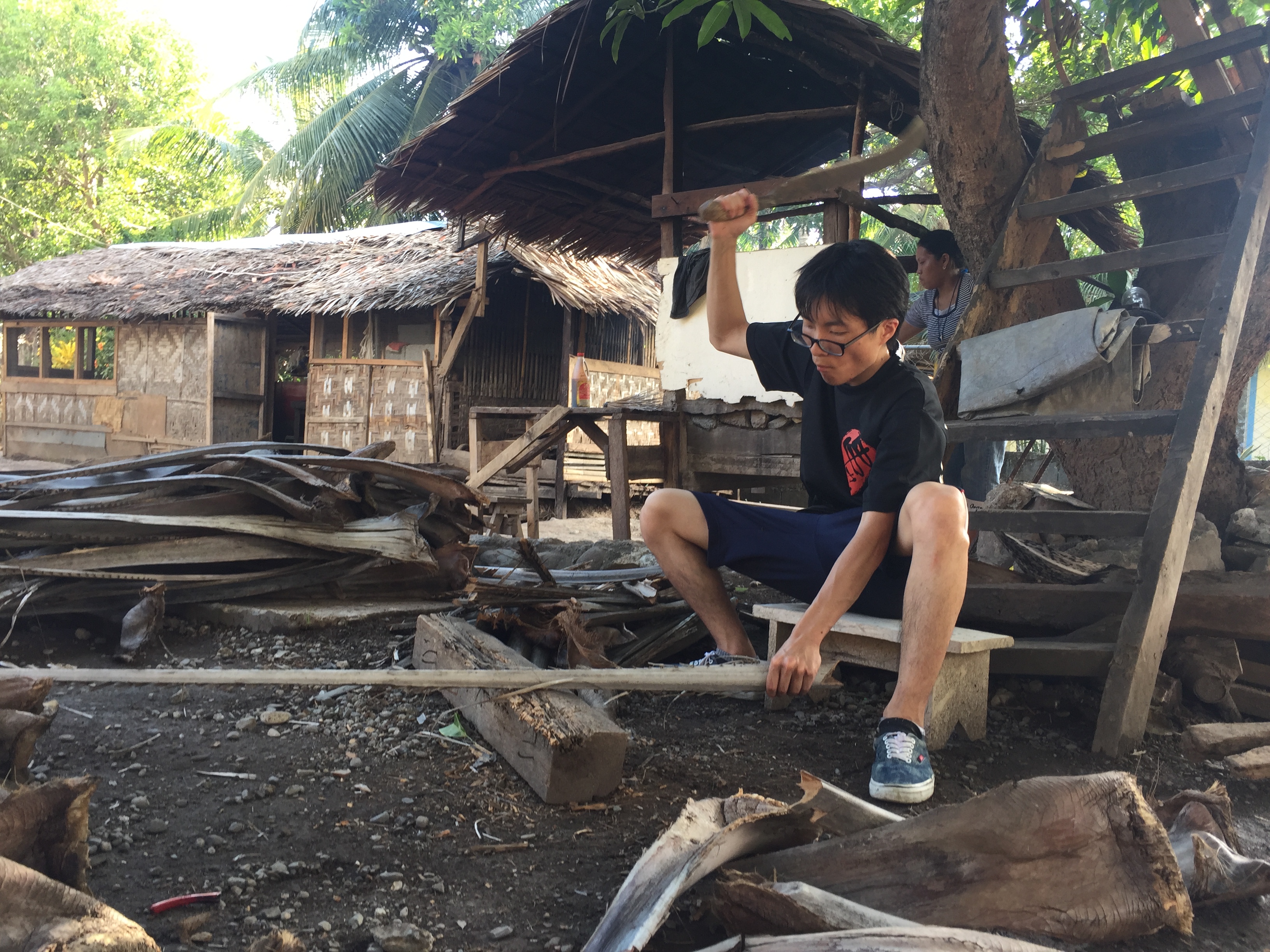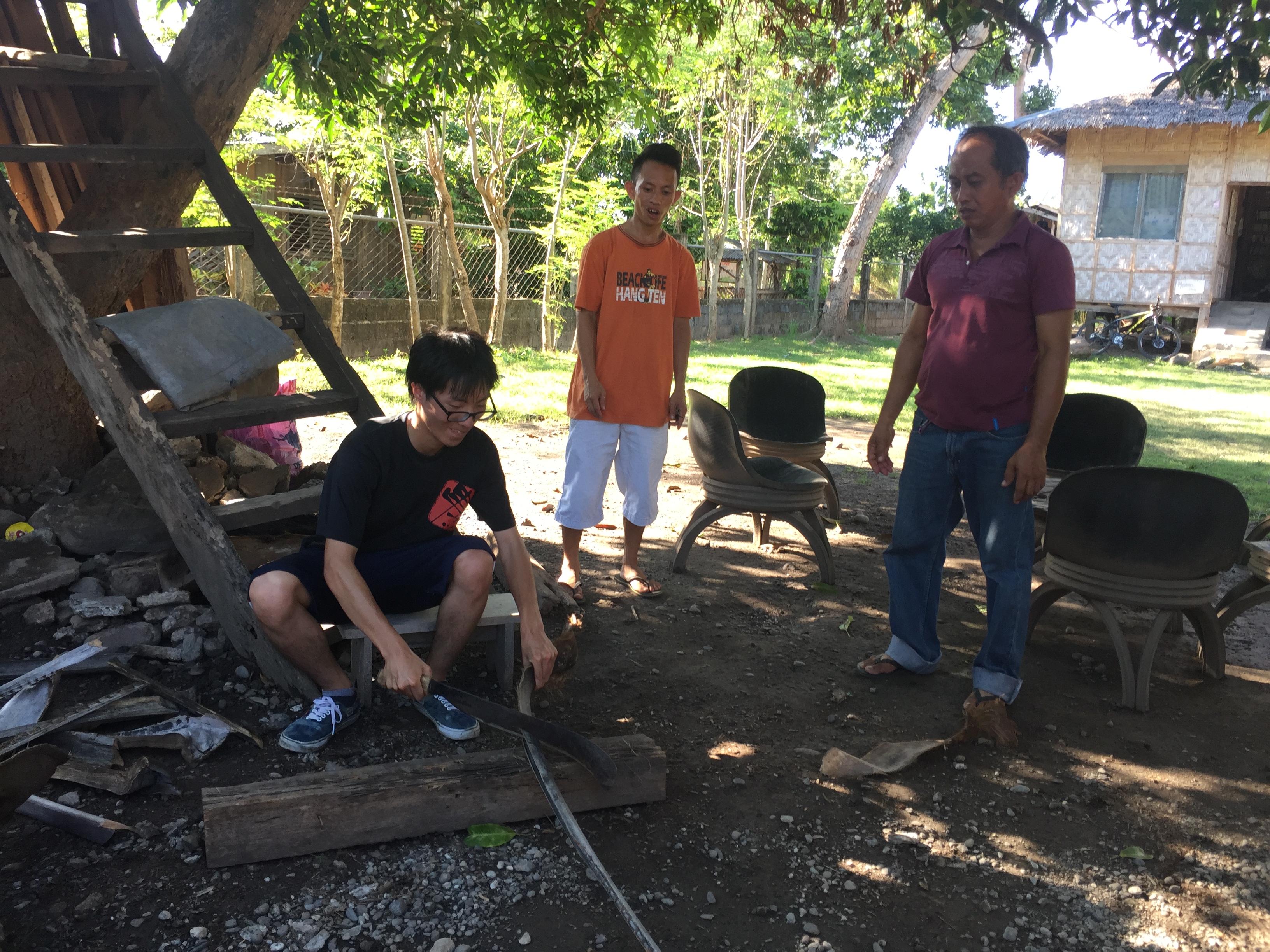 日本ではまず体験することのない薪割り体験。ヤシの葉を拾うところからやりました。みんな、凄い体験をしたと感動していました。ご飯を炊くのに、炊飯器のボタンを押すだけではなく、ハウスオブジョイではこんなに大変な作業をしたからこそご飯が食べられるのですね!