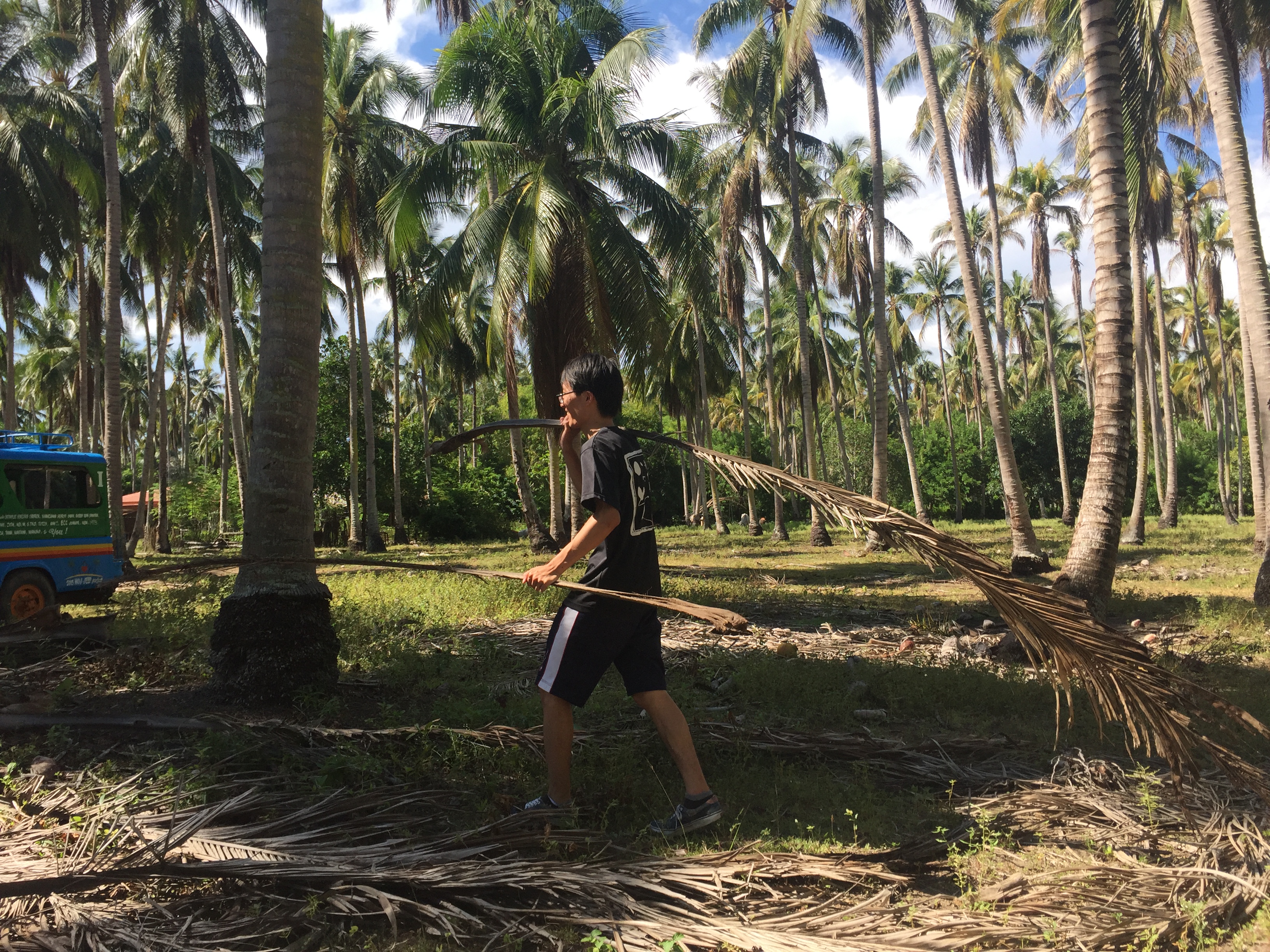 まず、落ちて乾燥しているヤシの葉を集めます。