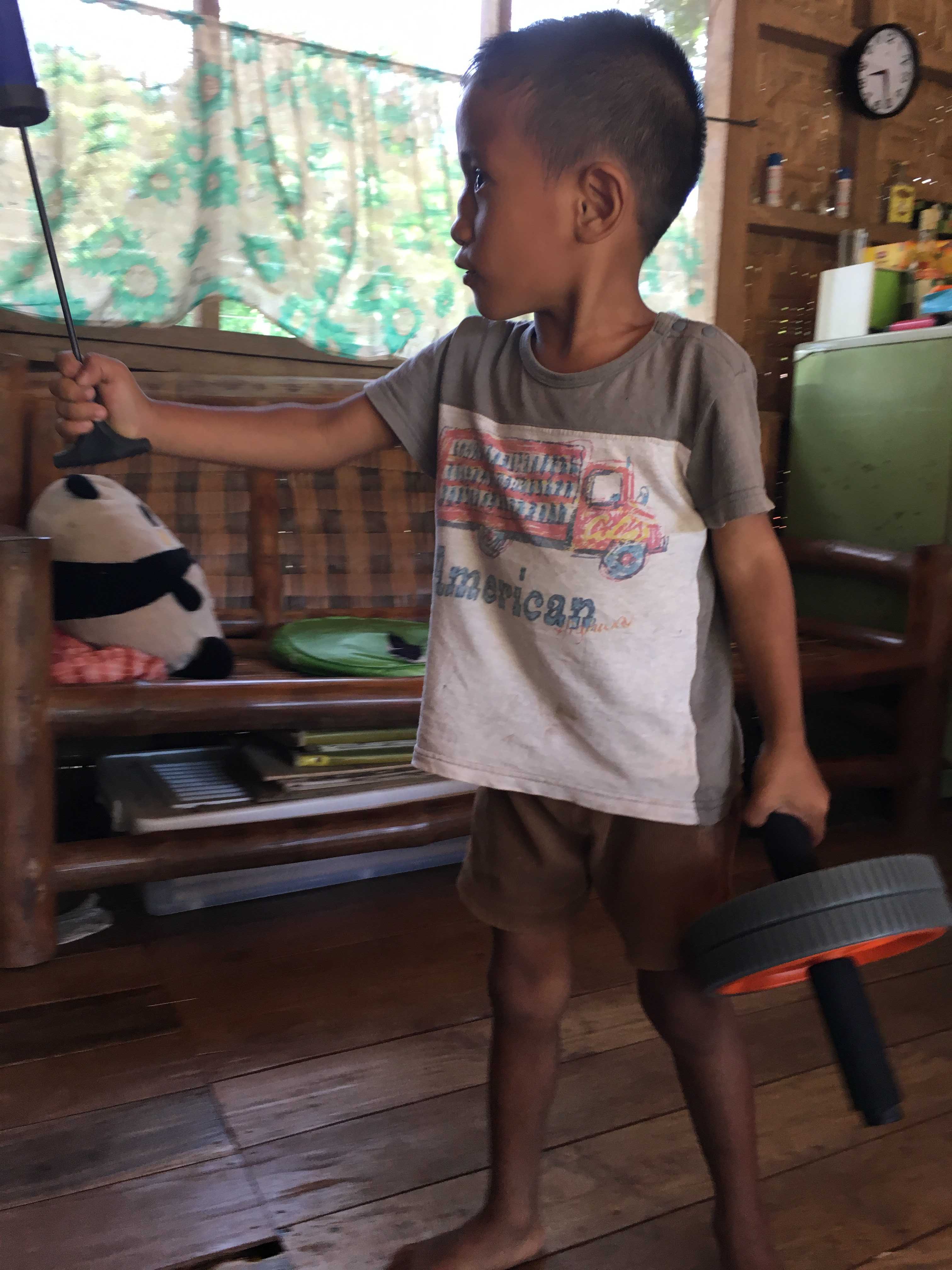 すっごく楽しそうです。 次はどんな動きをするのかな?様子を見ていると、今度はボールの空気入れを手に取り、エクササイズグッズは強そうな道具になりました。この後アルジェはセリフを言いながらカッコいいポーズを決めていました。