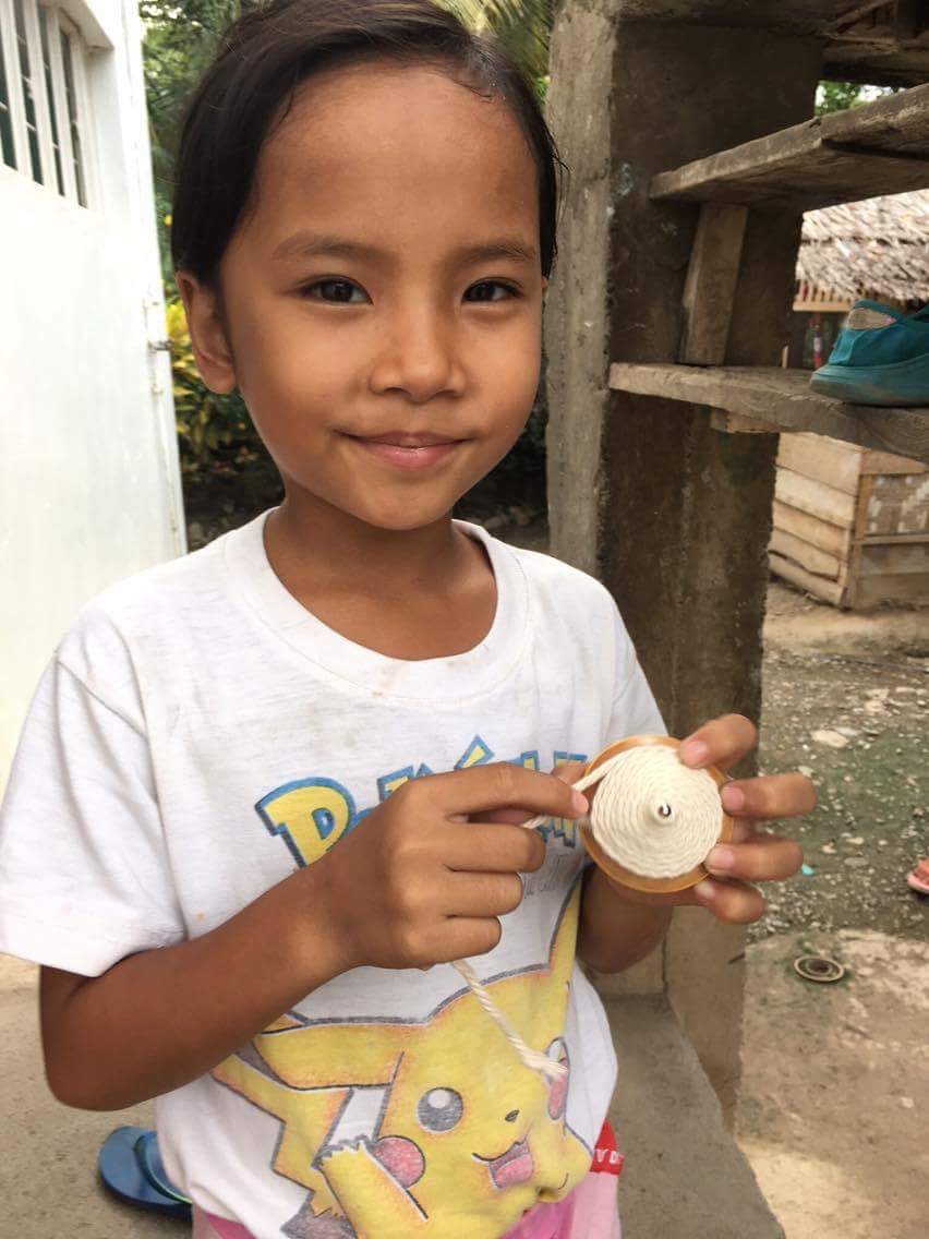 ボランティアスタッフのタクマです。本日はみんなで木ゴマで遊びました。エミリが丁寧に糸を巻く1枚から始まります。