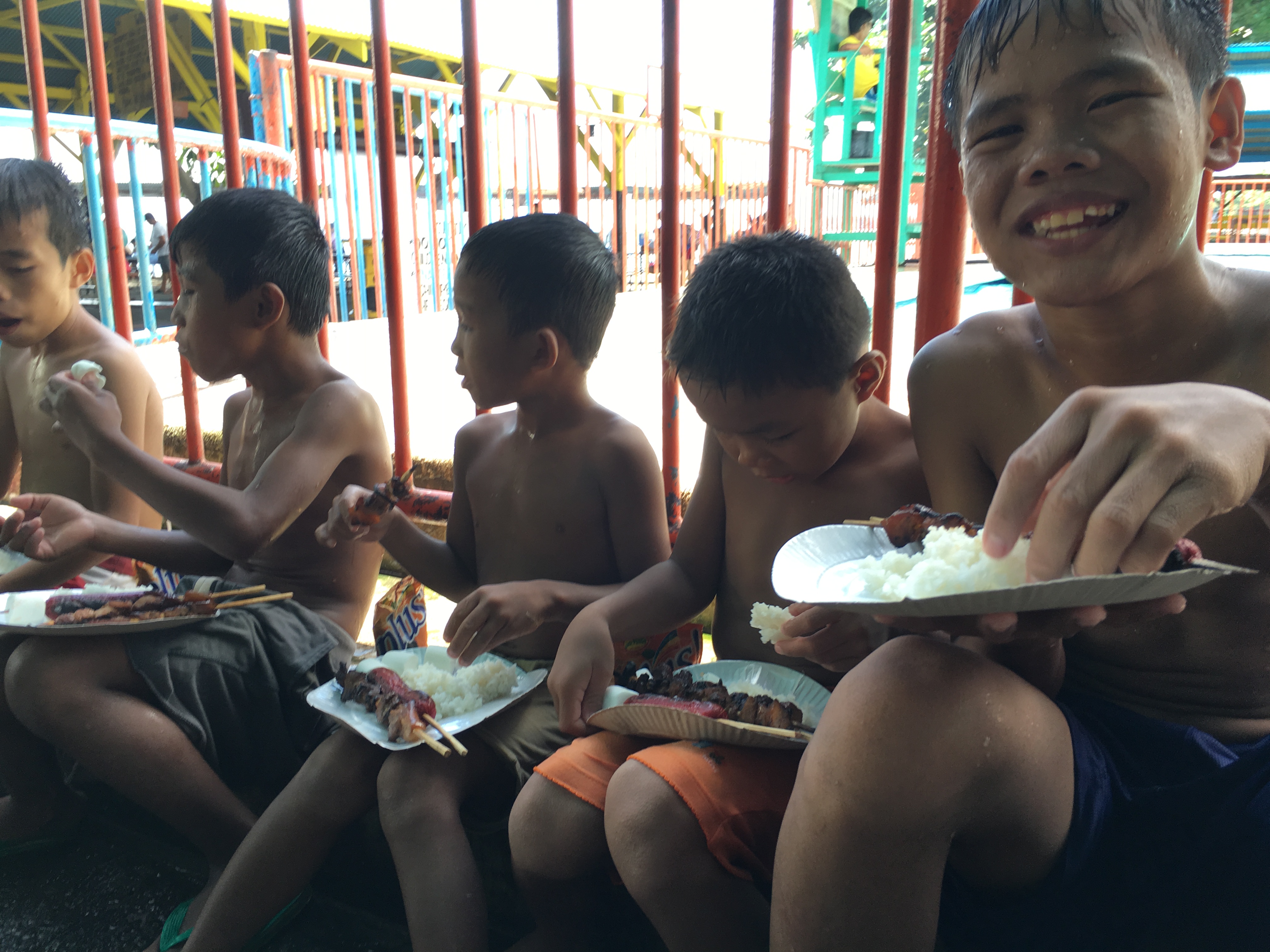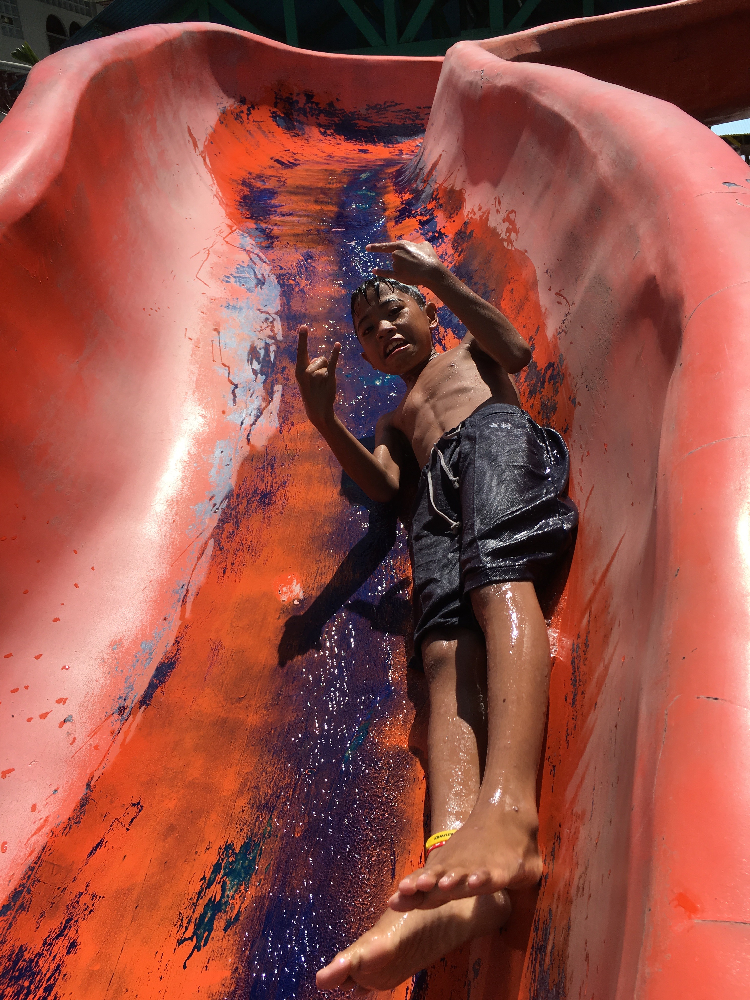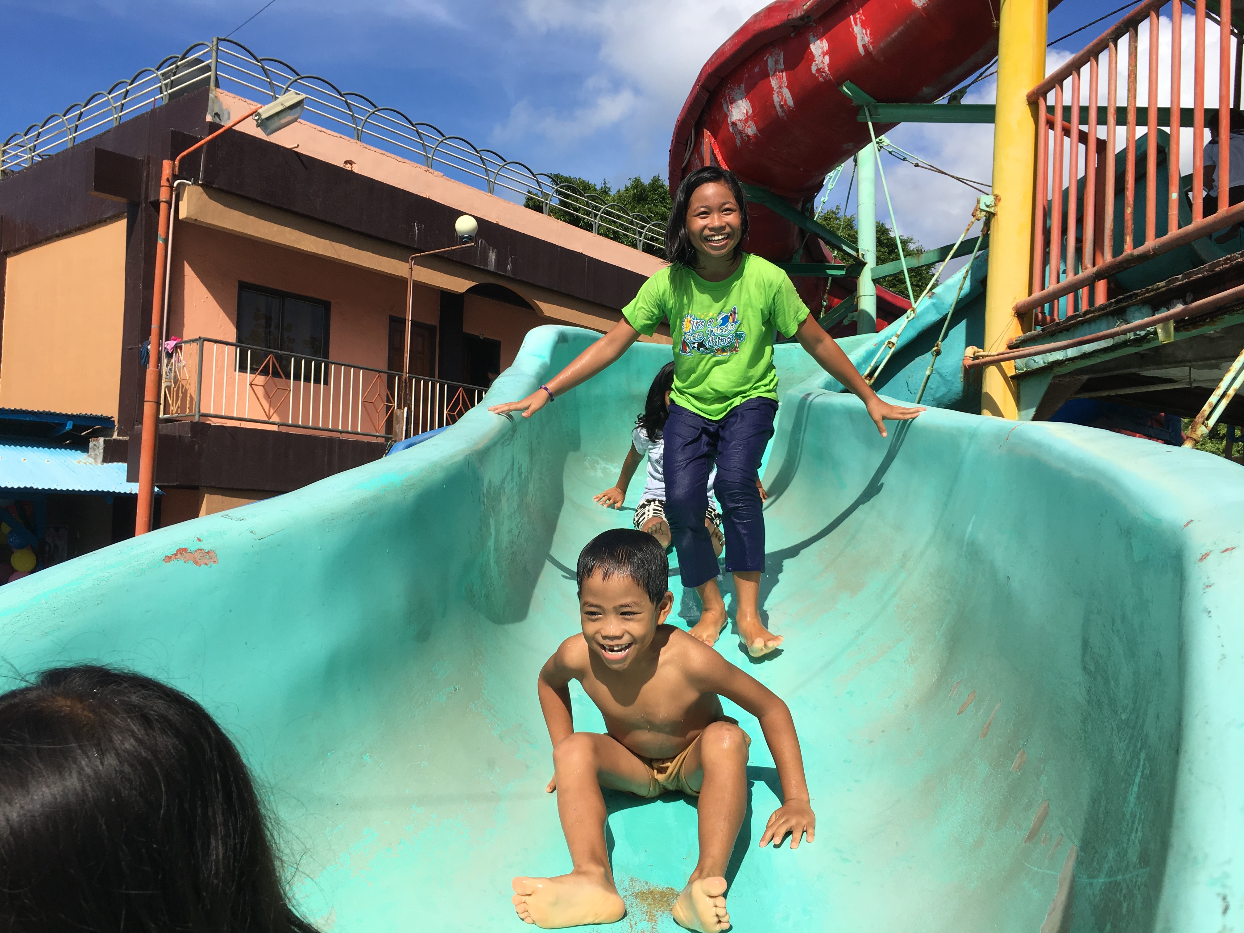 ウォータースライダーで遊ぶ子供達。何回も階段を上り下りして、何時間もウォータースライダーで遊んでいました。僕もヘトヘトになるまで一緒に滑りました。