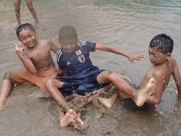 あっという間にできた大きな水たまりで、びしょ濡れ、泥まみれになって転げ回って遊びます。