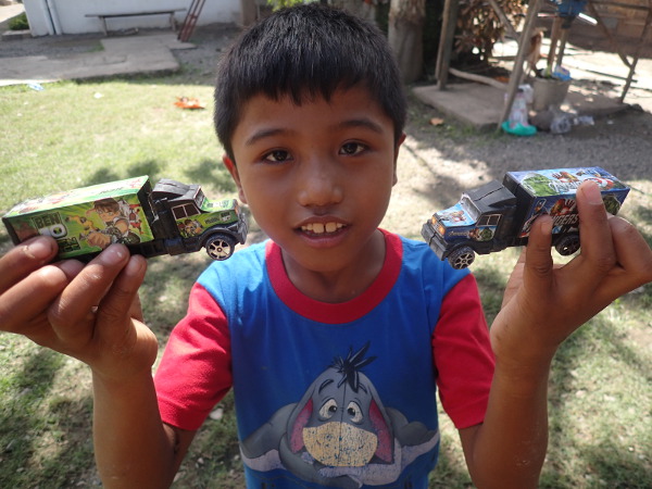 こどもたちがプレゼント交換でもらってきたおもちゃやお菓子でホクホク顔です。