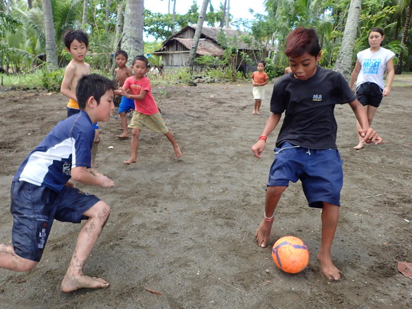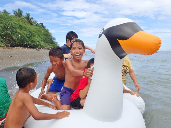 そしてみんなでウラワビーチへ!小林さんが日本から持ってきてくれた白鳥浮き輪が大人気です。