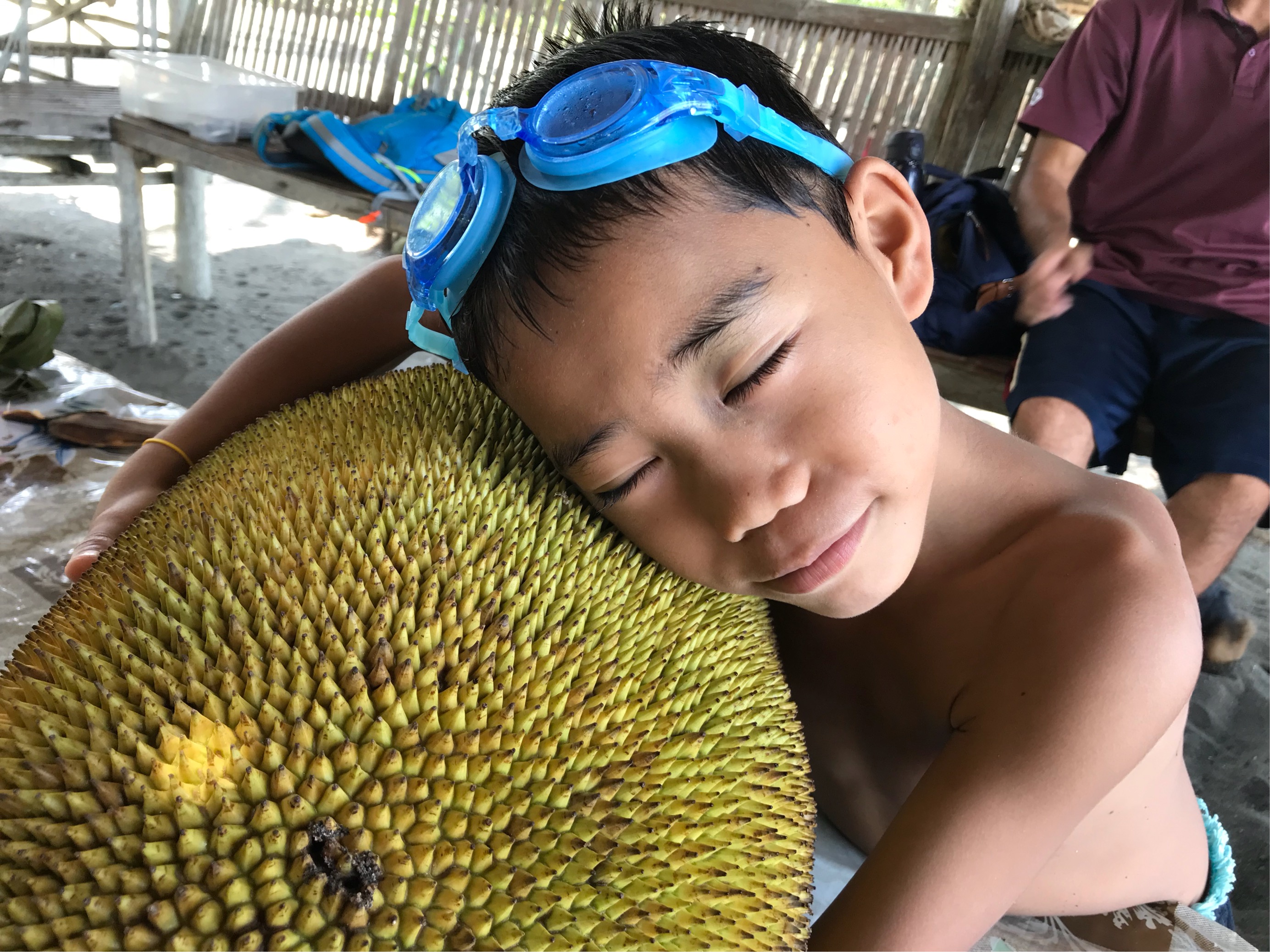 今日は阿部さんのお友達が遊びに来てくれて、大きなジャックフルーツを持ってきてくださいました!それを愛でるジャンジャン。可愛い〜。でも、トゲトゲ痛くない?(笑)