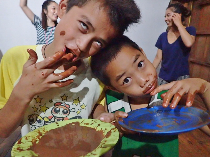 最初は行儀よく並んで、ちょっとずつバナナやリンゴにチョコをつけて食べていたこどもたちですが、