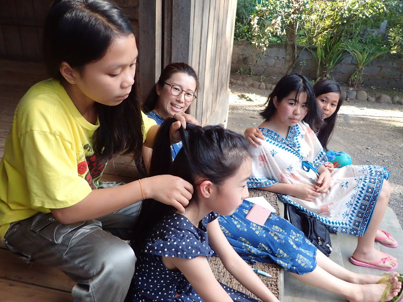 今日到着したユメちゃんは11歳。長い髪をリサメイが「うらやましーい」と言いながら編んであげています。