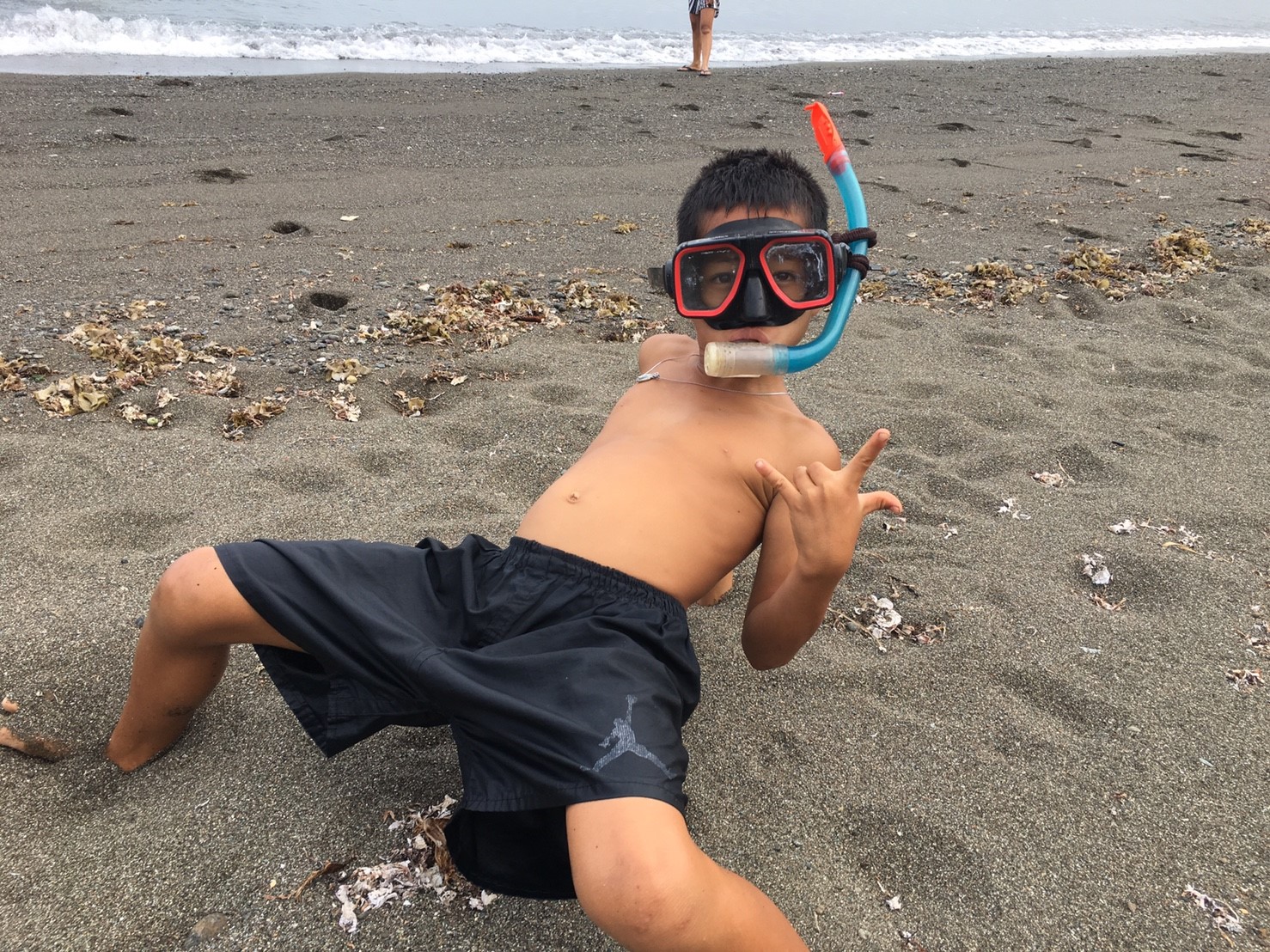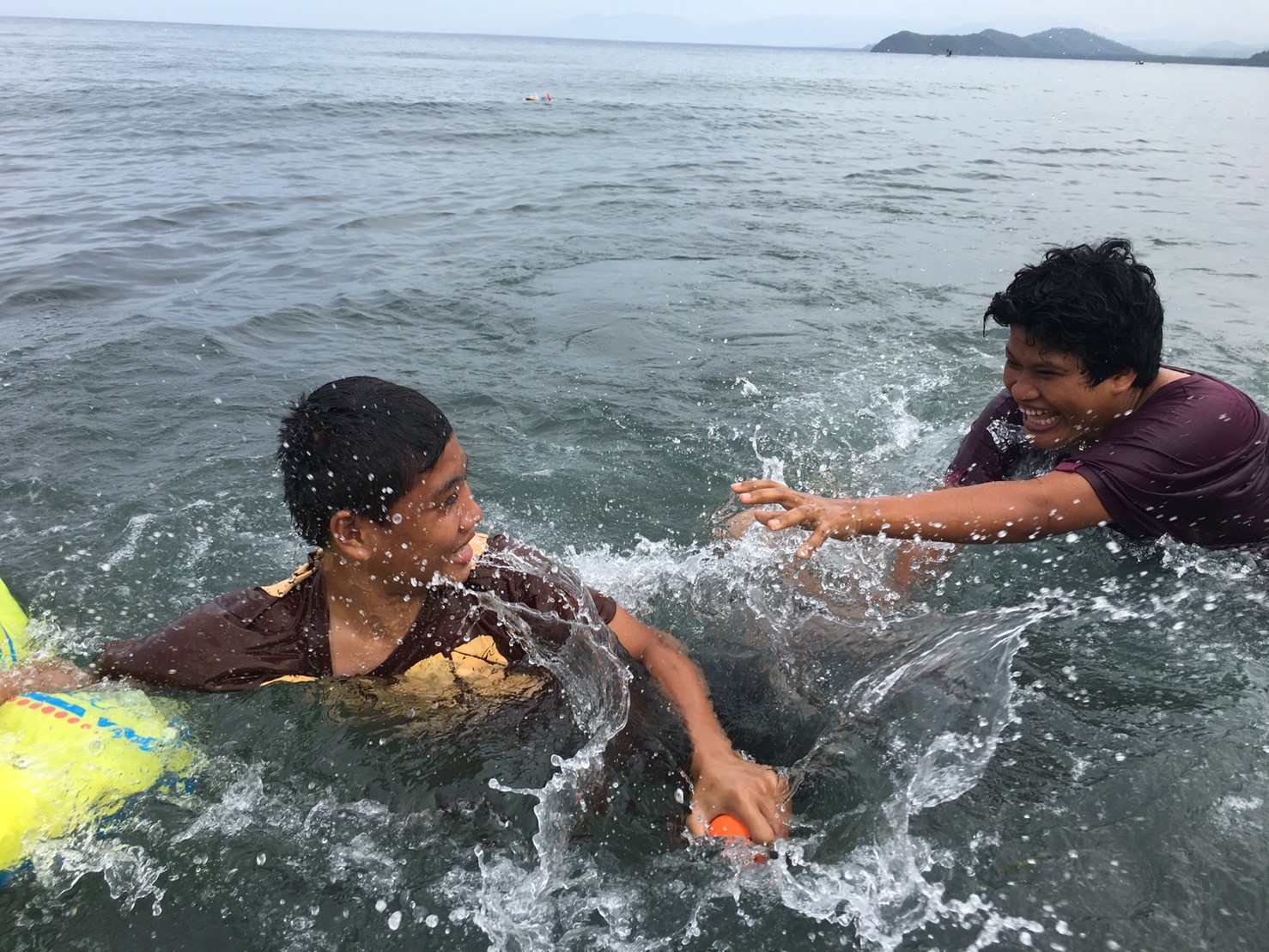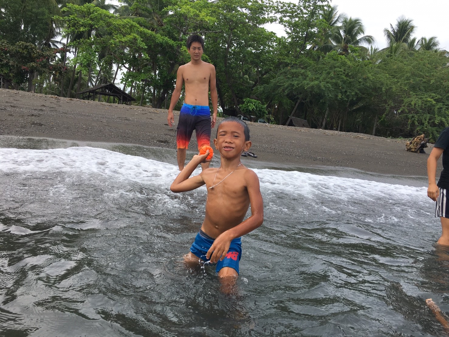 今日のウラワビーチは、曇りだったのでやや水につかると寒いのですが、ぼくらはそんなのお構いなしにはしゃぎます。