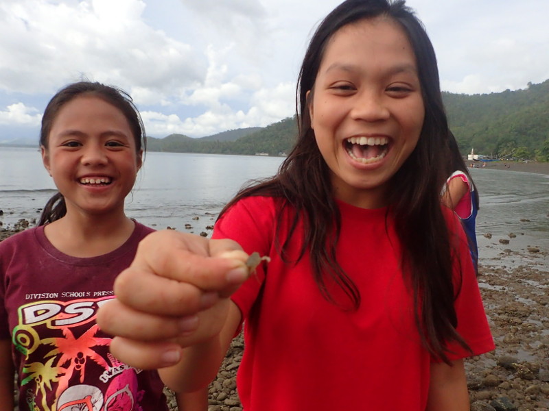引き潮の干潟でカニやヒトデを捕まえて女の子たちが喜んでました。
