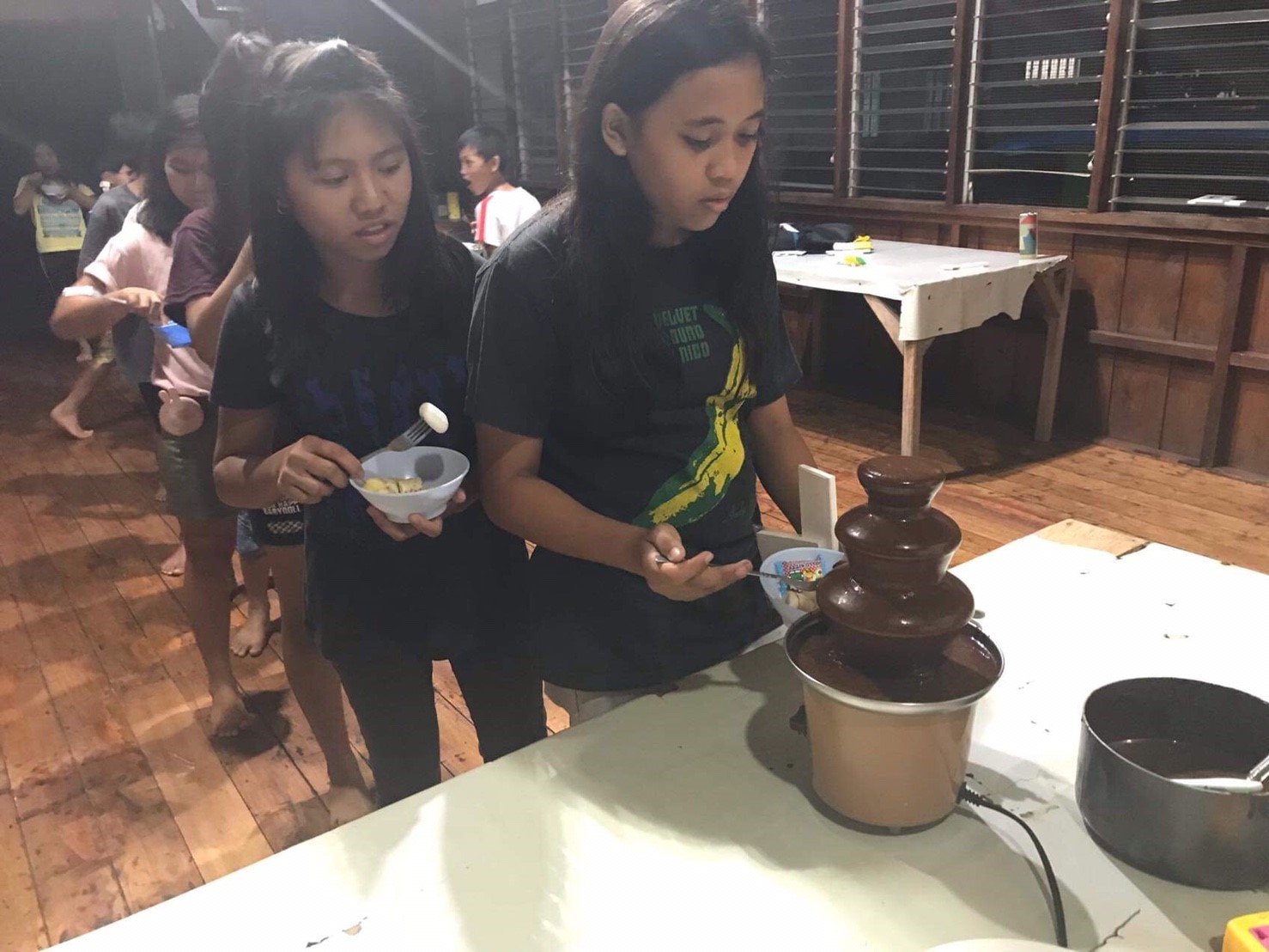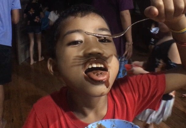 そして今日は!チョコレートお兄さんことたいじゅお兄さんのチョコレートパーティも楽しみましたよ!実はたいじゅお兄さん、7月後半から8月までフィリピンに帰ってきてくれています。子供が大好きなチョコレートお兄さんが帰ってきて、ハウスオブジョイがまたにぎやかになりました。お昼ご飯を食べ終わってから着々と準備を進め、いざナイトパーティ開始です!子供たちは大好きなチョコを目の前に、目が真剣です。
