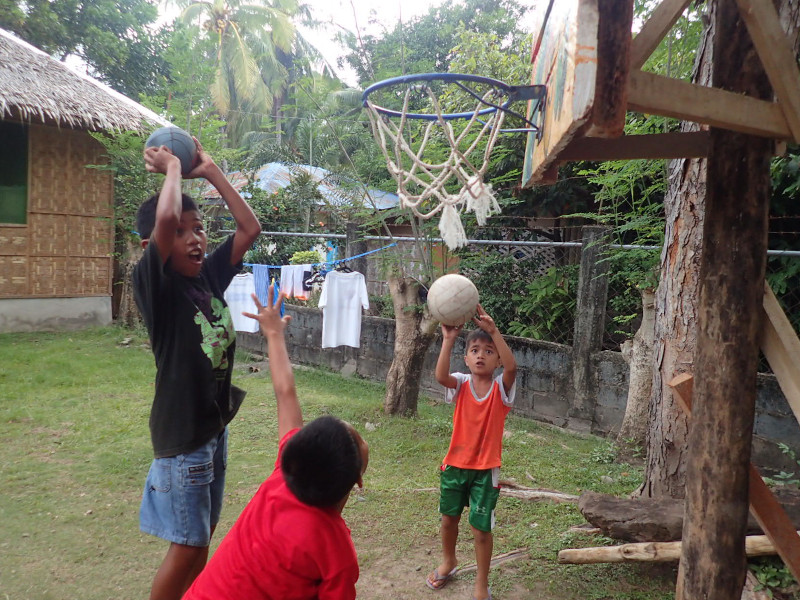作ってもらったこども用バスケゴールが大人気!壊れるからダンクはするなよー!
