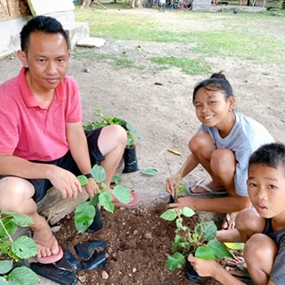クヤアルチーと子供たちがココナッツ腐葉土とこれから育てる苗を袋詰めしている姿をパシャリ。いやー再利用できてること、子供たちが土に触れる姿、素敵ですね。