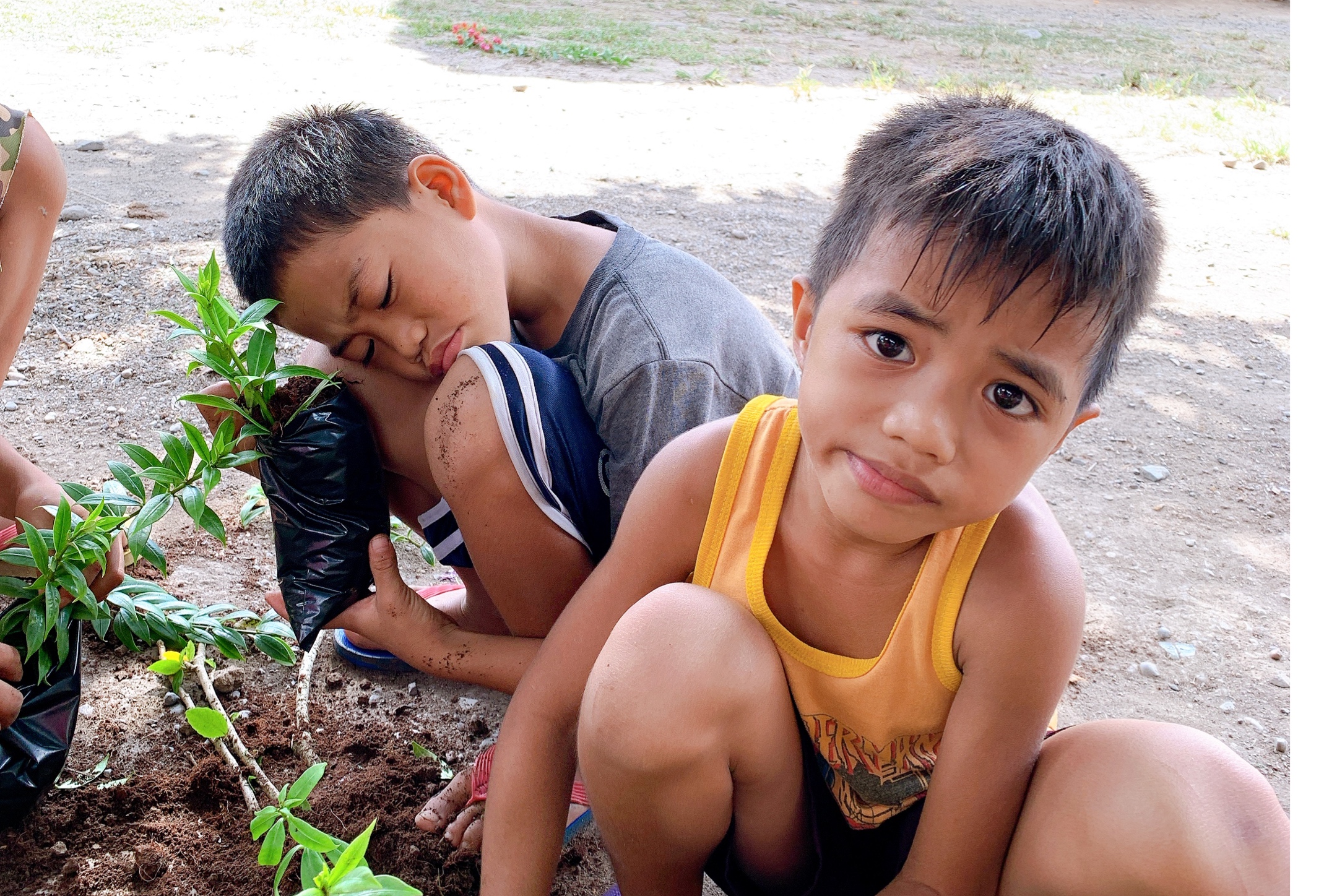 コロナの影響で学校がない子供たち。今日は朝からココナッツを使ってJMとアルバートが花壇を作っているようです。