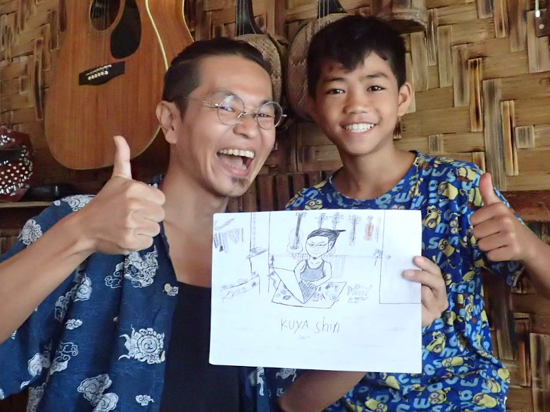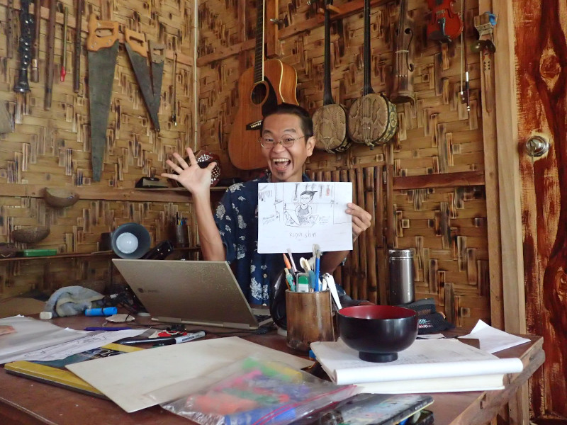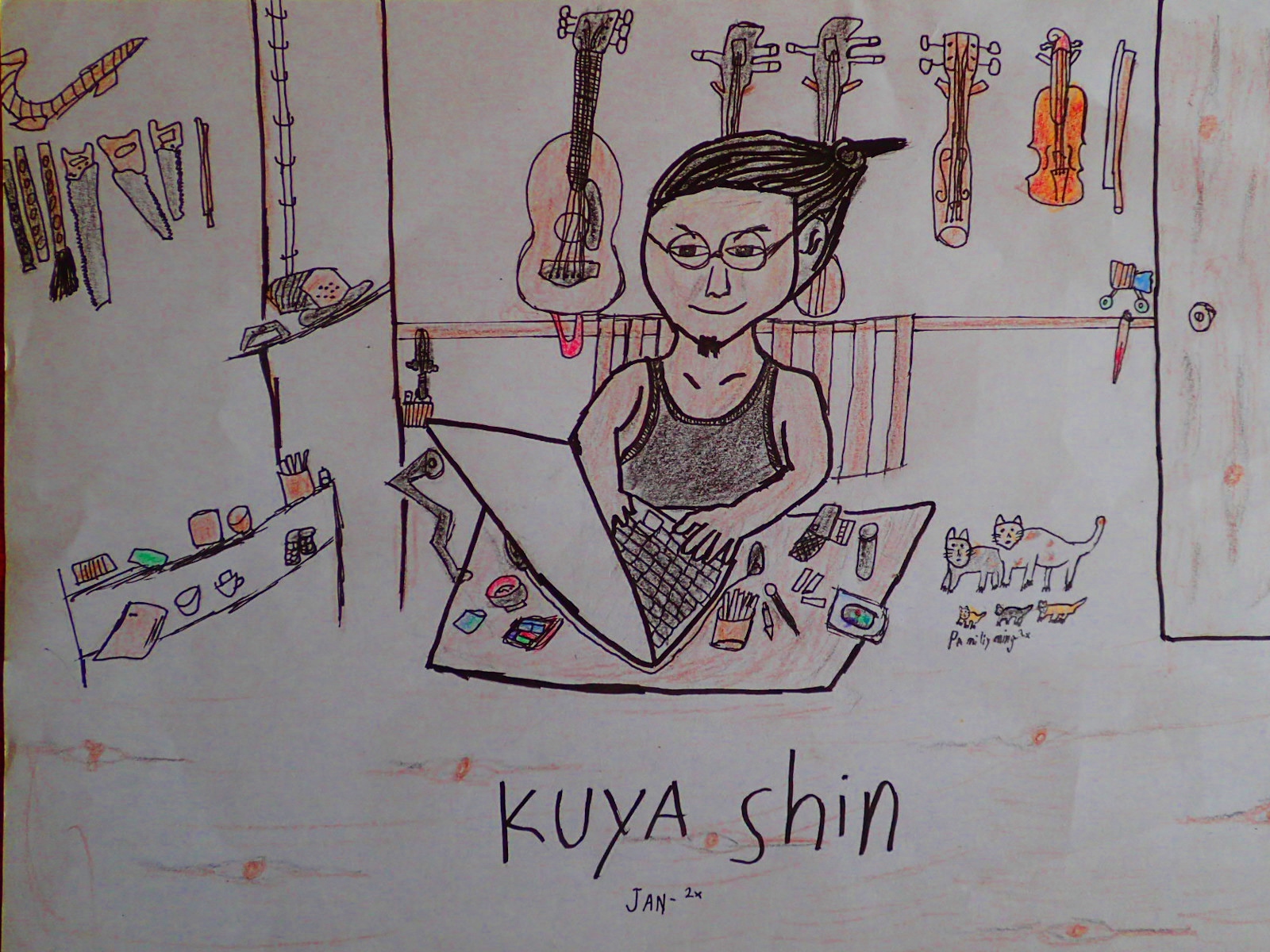 後ろの壁にはバイオリン、竹バイオリン、三線、ギターと弦楽器が並び、