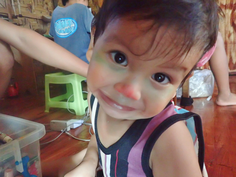 クレヨンで遊んでいて顔が汚れたイージェイは、