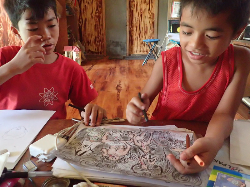 ジャンデルは私が仕事で描いた「フィリピンのおばけシリーズ」を片っ端から模写中。