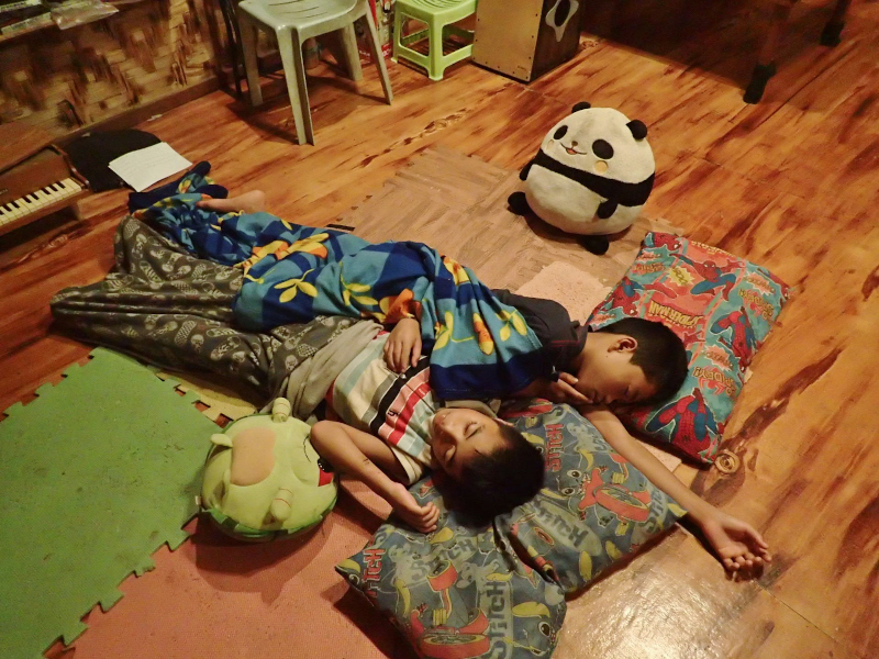 「え?…ここで寝ていい?」と言うジャンジャン。うーん、ちょっと肝試しで怖がらせすぎたか。(笑)