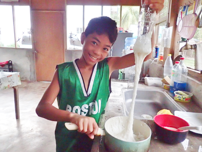 フィリピンにももち米は売っているので、それを炊いてコーラの空き瓶でひたすらつきます。