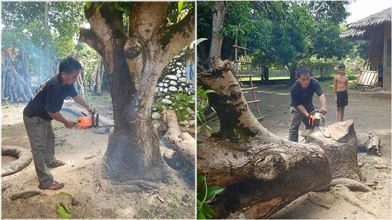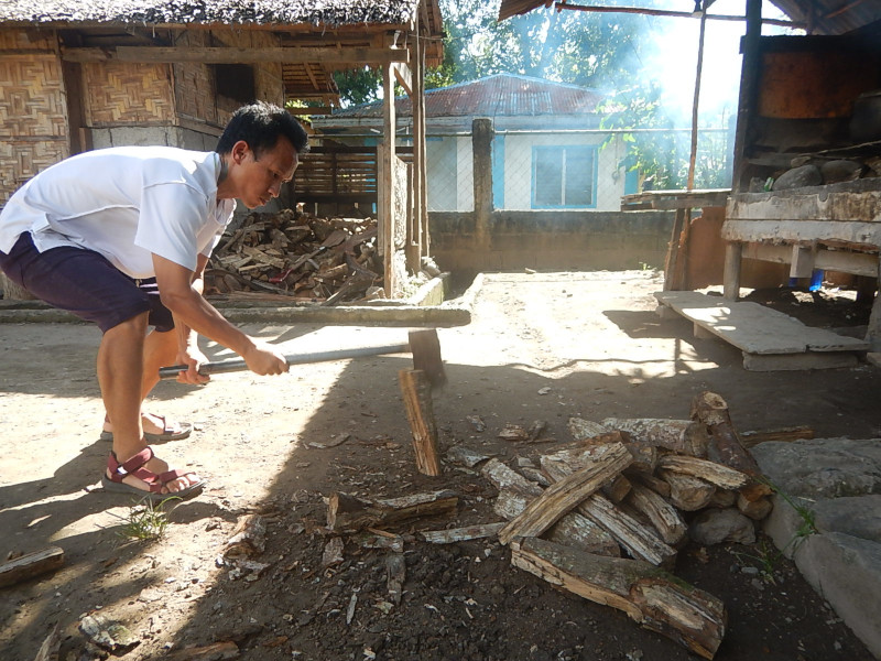アルチーさんは料理のための薪割りです。この薪は、先日ドドンさんが切り倒したマンゴーの枝です。