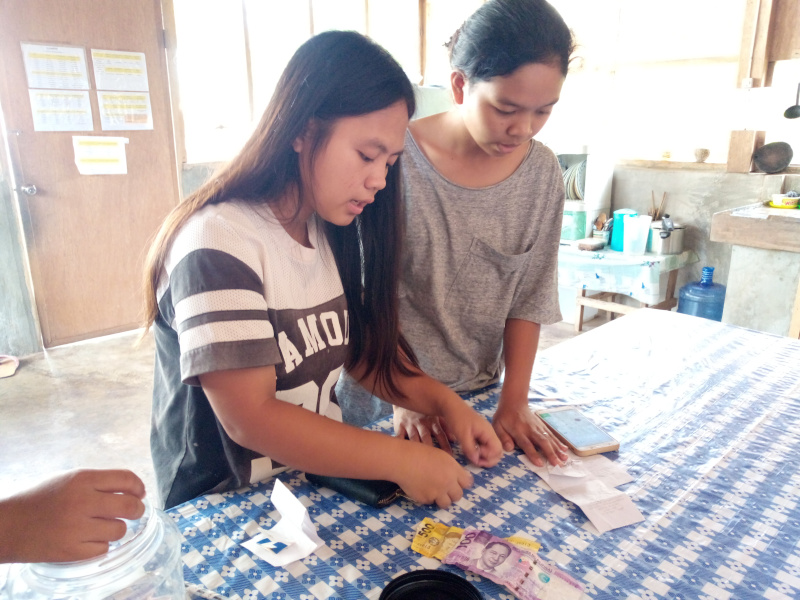 市場で食材を買ってきて、レシートと残高を検証するマイカたち。