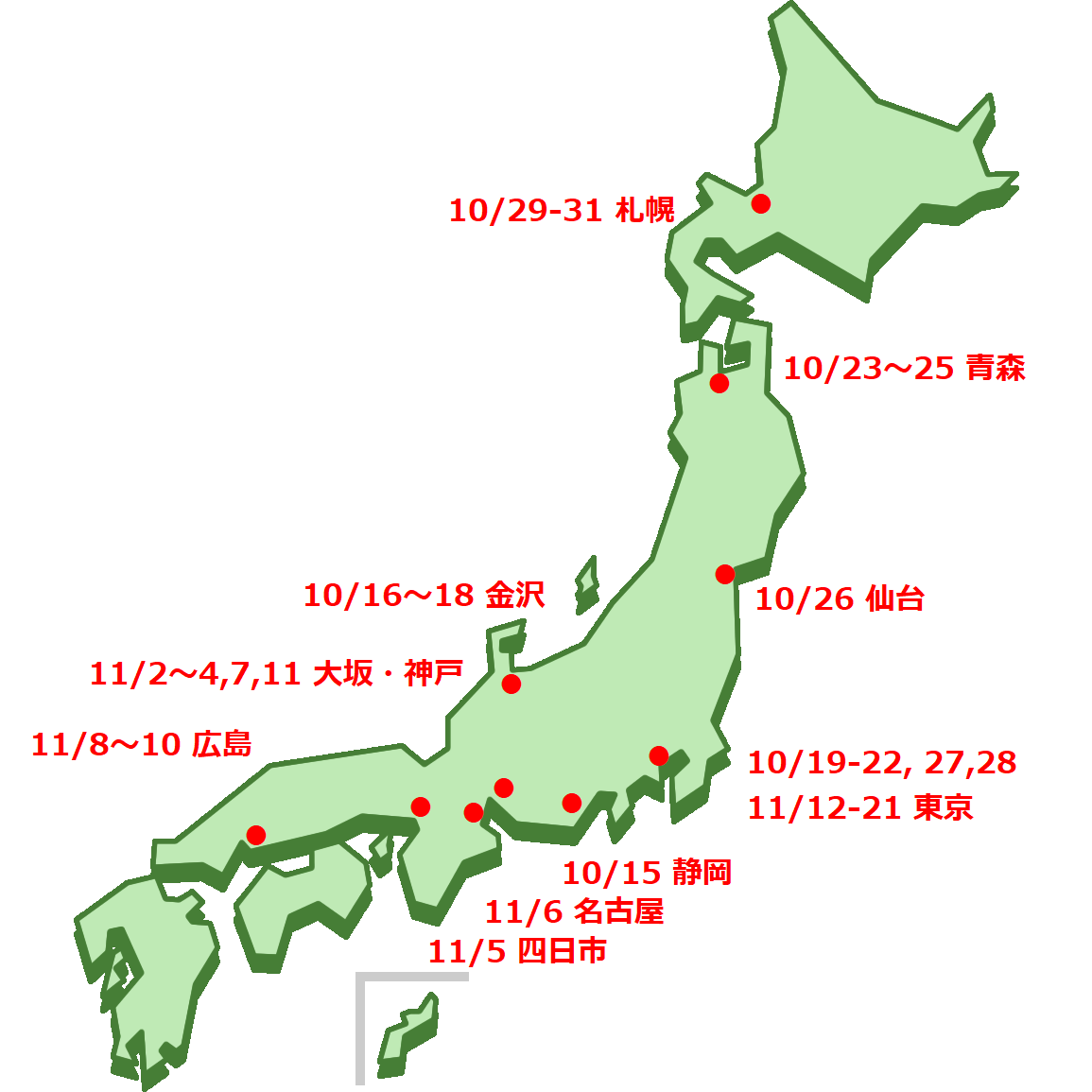 10/18 金沢、10/19, 20, 22,28 東京、11/4 ,11/12 大坂、11/15, 17, 18, 20 東京